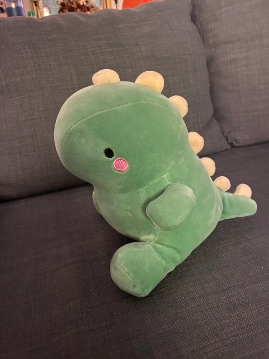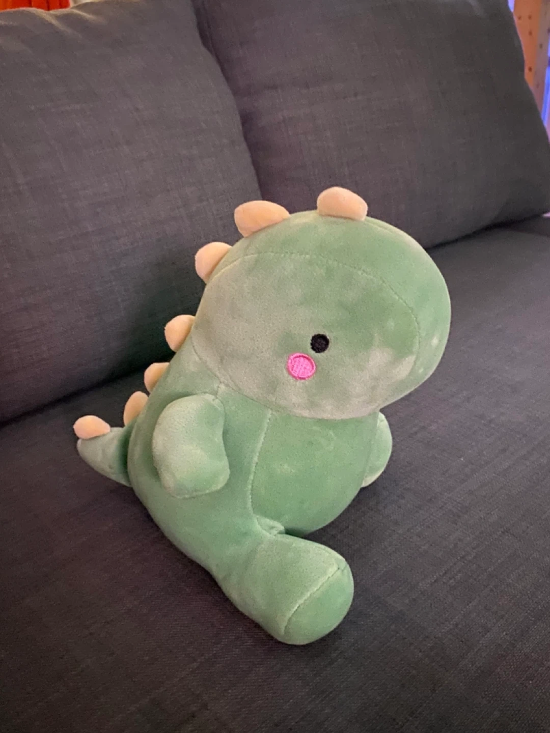 A cute and cuddly green dinosaur plush toy! It's in great condition and ready for a new home. Perfect for kids or anyone who loves dinosaurs Taking cash only