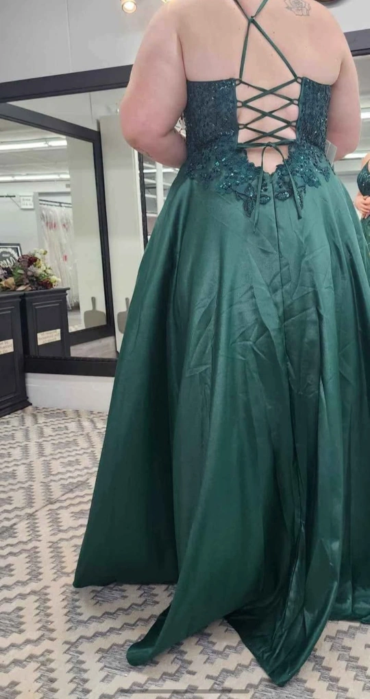 Selling a beautiful green formal dress! It features a detailed bodice and a flowing skirt. Perfect for prom or any special occasion! Originally $650