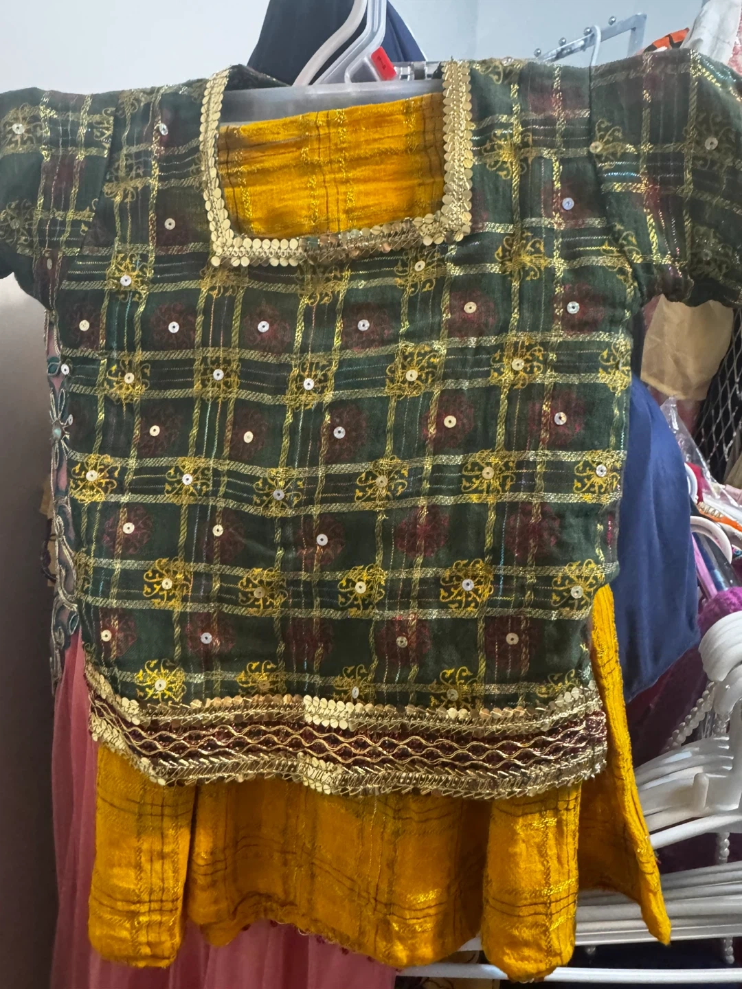 Selling a lovely kids dress with a unique design! It features a dark green and gold plaid pattern on the top, complemented by a yellow skirt. The dress has intricate gold embroidery and sequin details, adding a touch of elegance. It's perfect for a special occasion or adding a bit of flair to your wardrobe