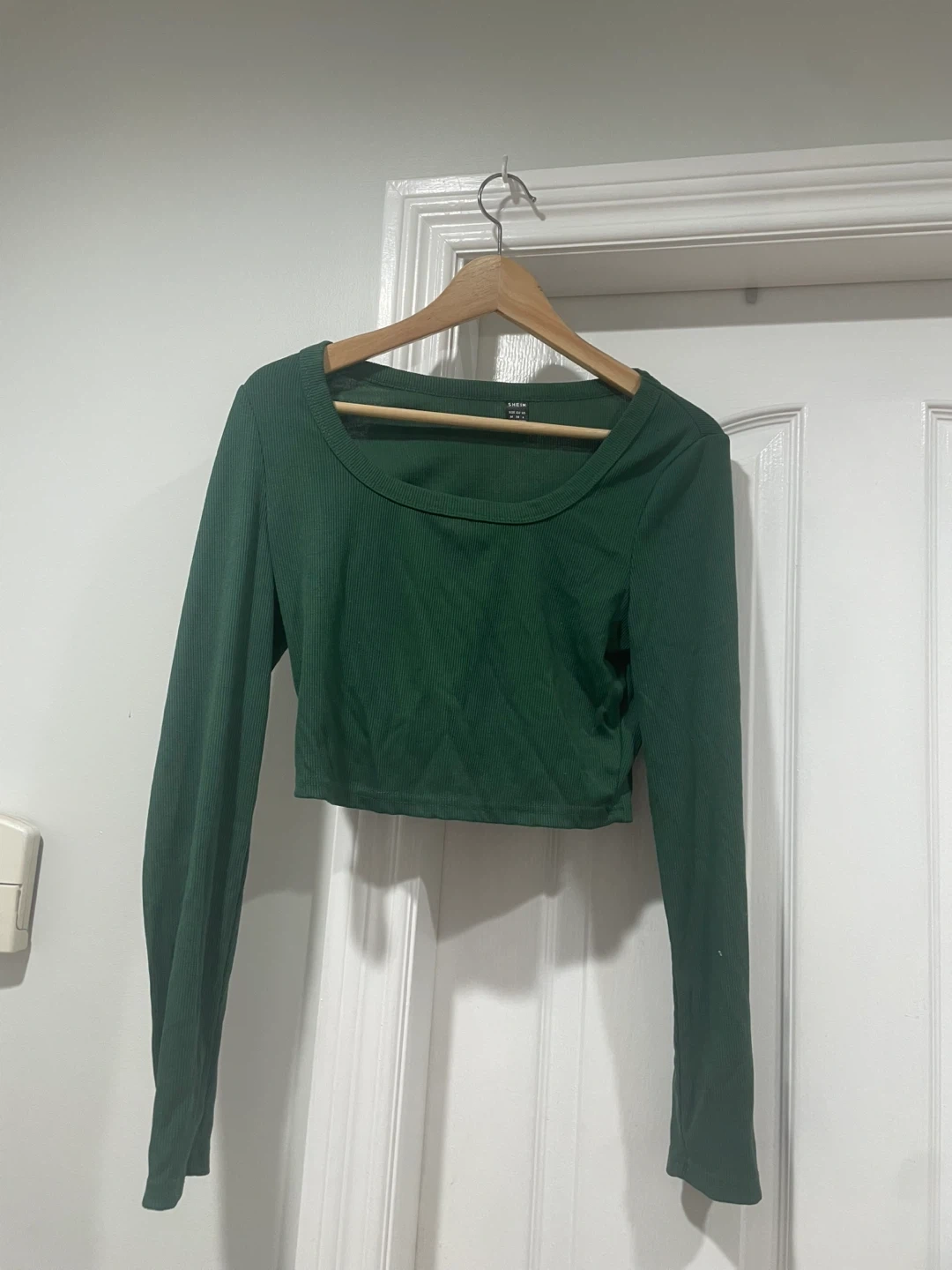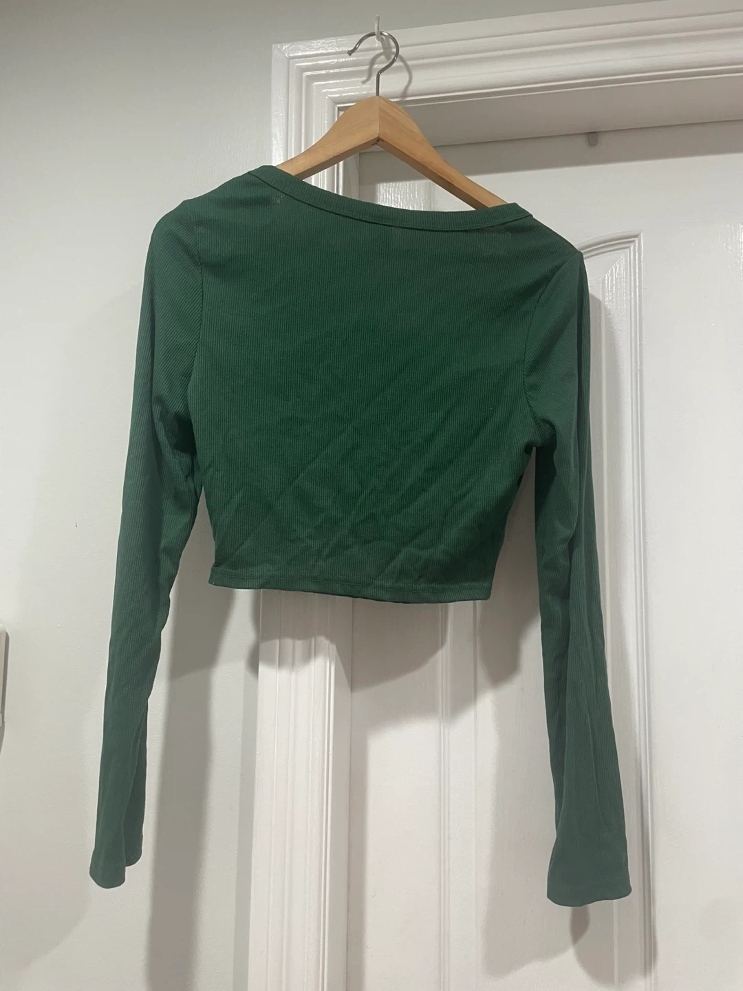 Here's a cute green long sleeve crop top! It's perfect for layering or wearing on its own. The material is soft and comfortable, making it a great addition to your wardrobe