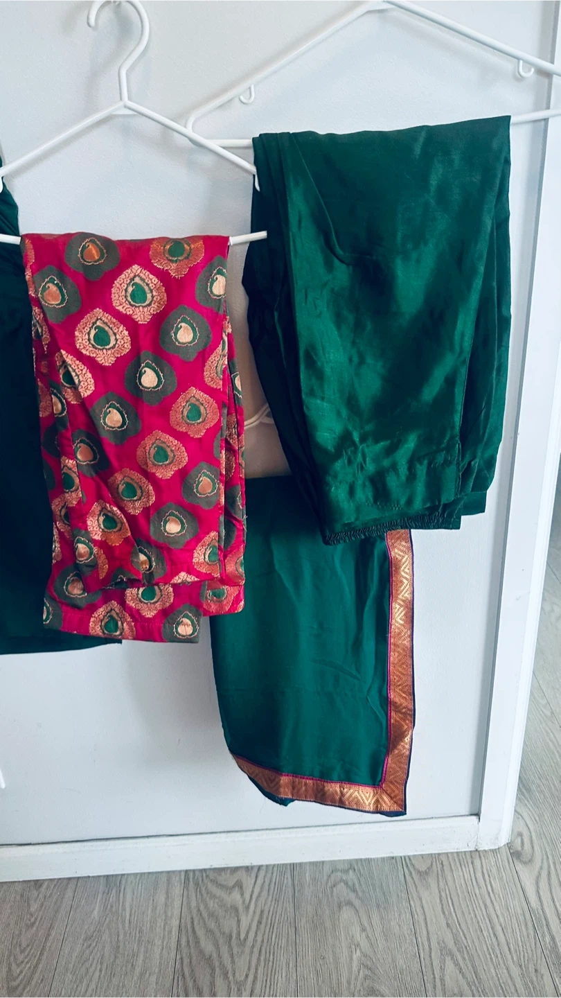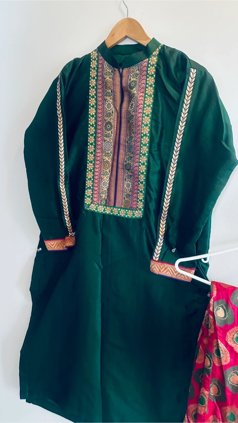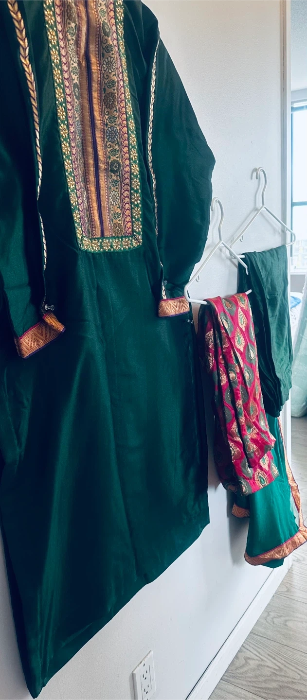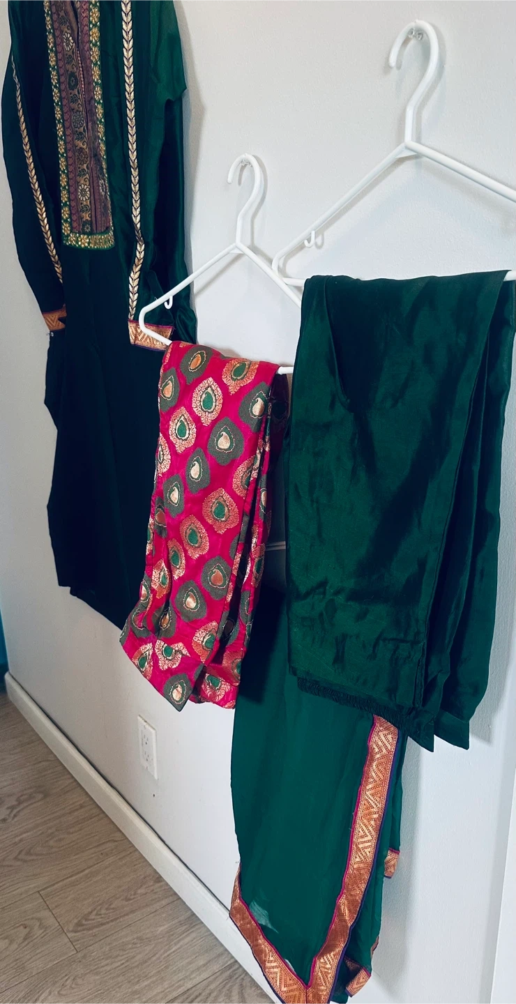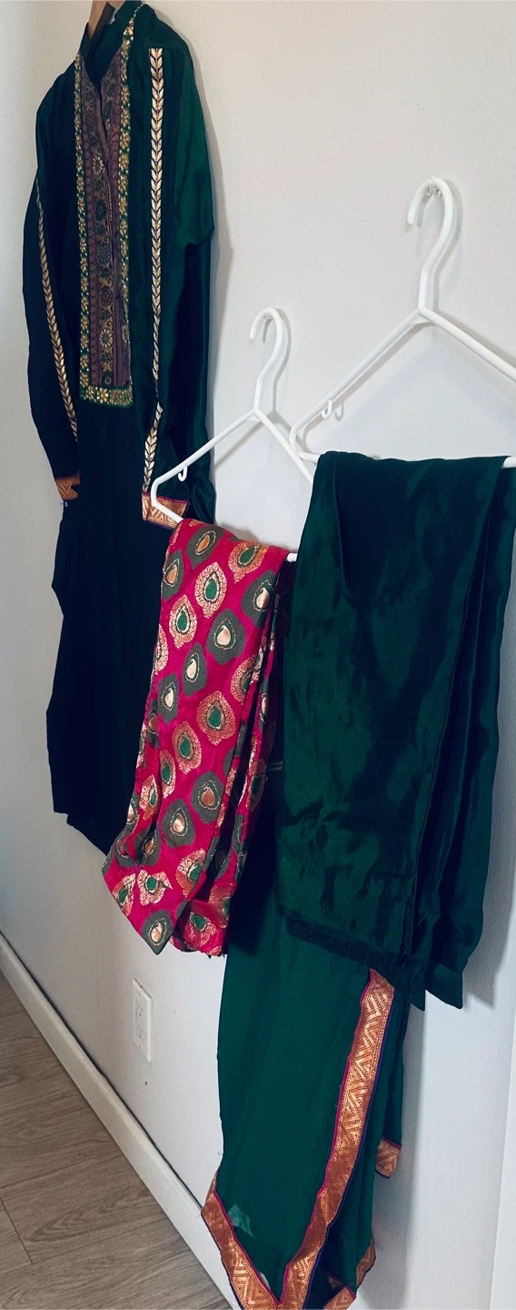 A beautiful green salwar kameez suit, perfect for a special occasion! The suit features intricate detailing around the neckline and sleeves, adding a touch of elegance. Includes the top, pants, and dupatta.