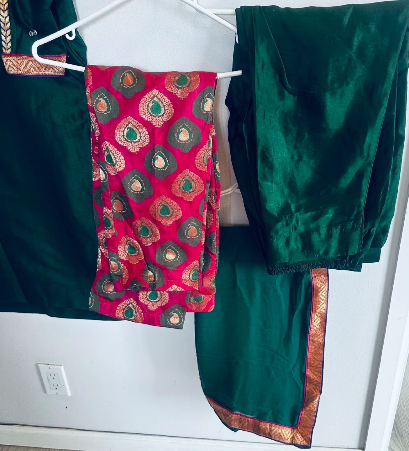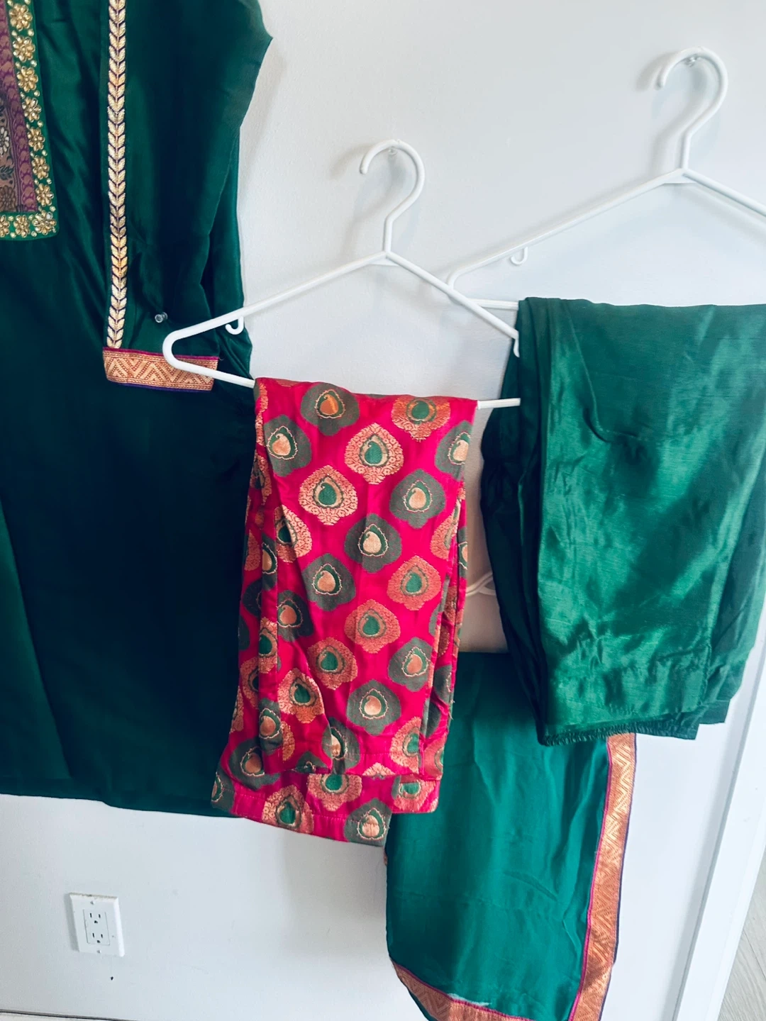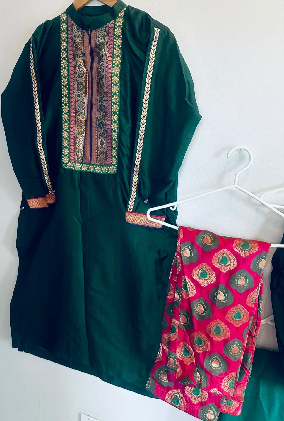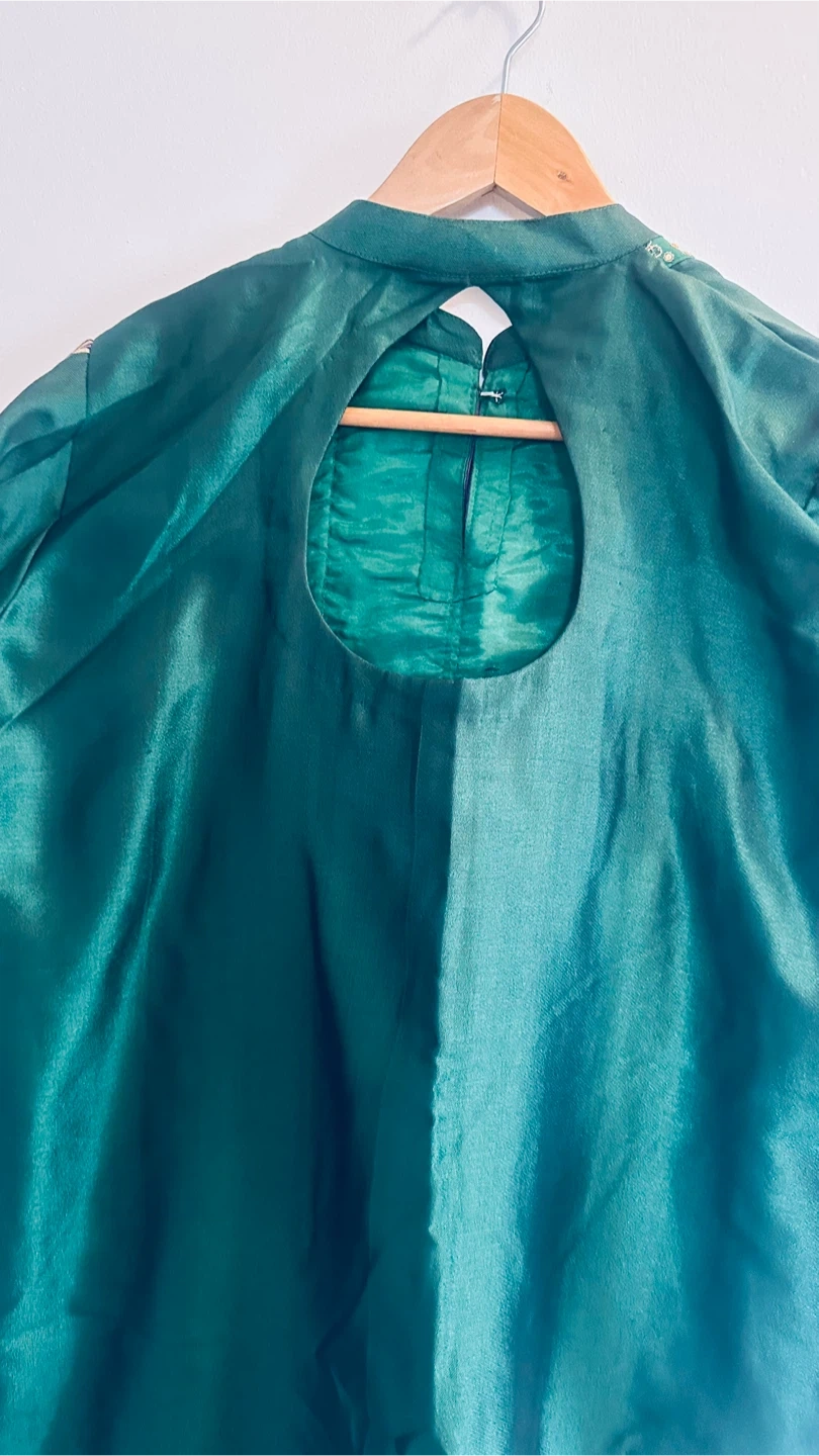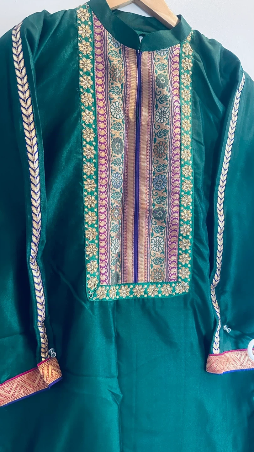 A beautiful green salwar kameez suit, perfect for a special occasion! The suit features intricate detailing around the neckline and sleeves, adding a touch of elegance. Includes the top, pants, and dupatta.