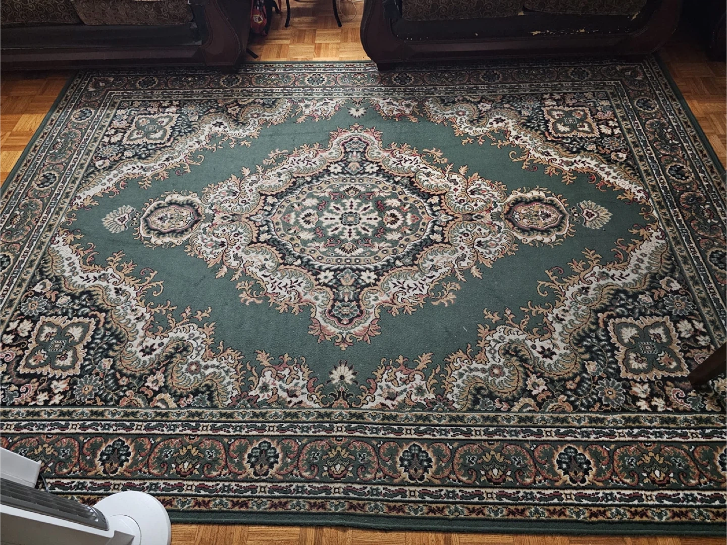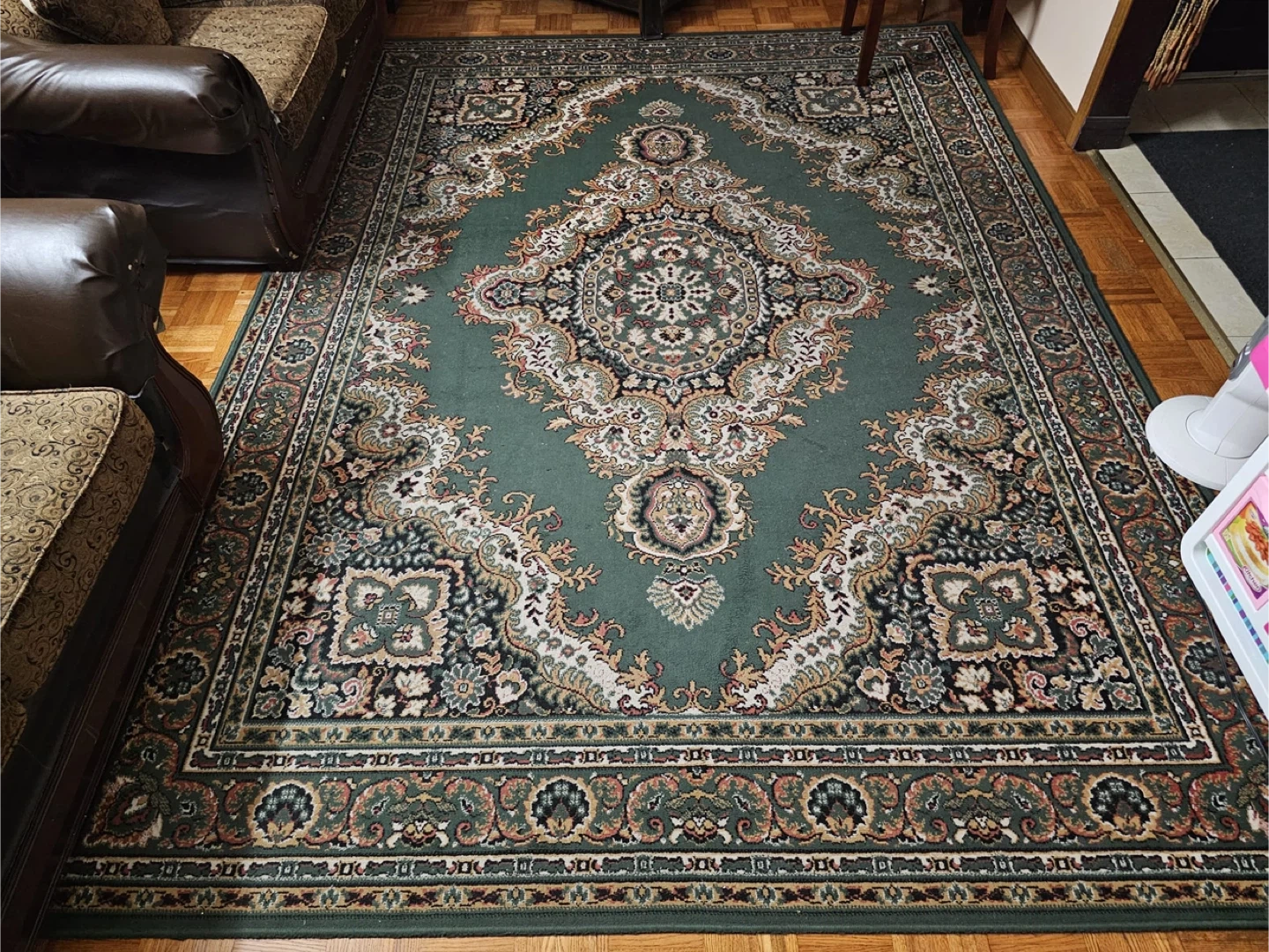 Beautiful green area rug with an intricate, classic pattern! It's in great condition and would add a touch of elegance to any room