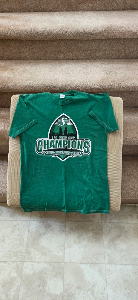 Selling a green Saskatchewan Roughriders t-shirt, celebrating their 2013 Grey Cup championship! Great for any Riders fan looking to show their team spirit. It's in good condition and ready for a new home