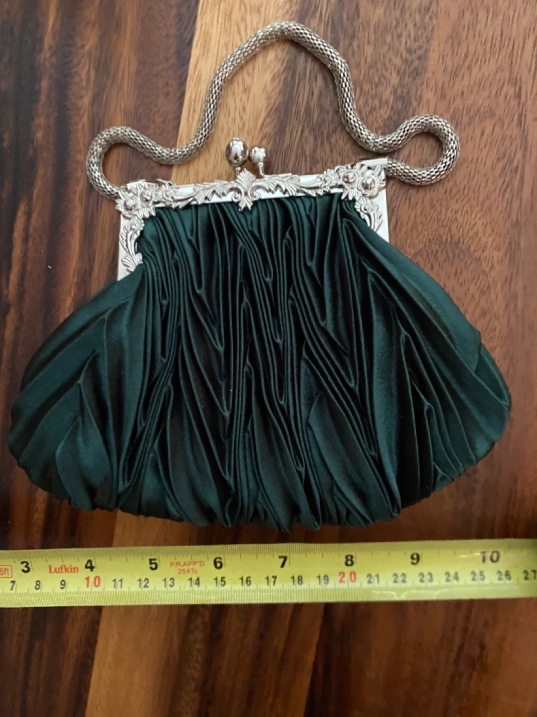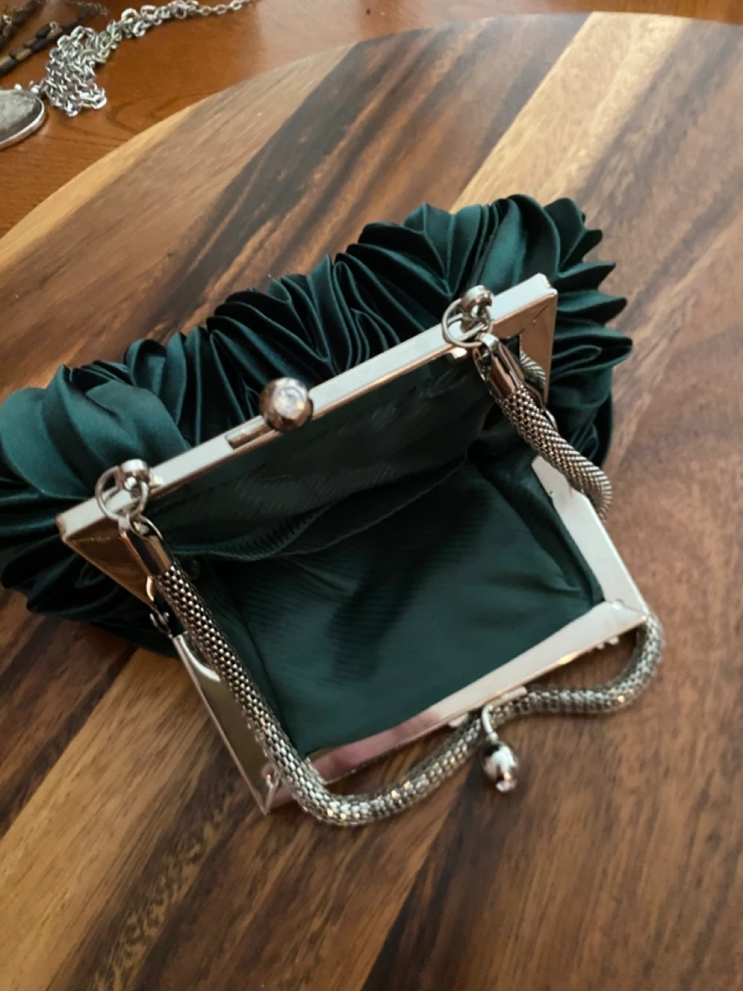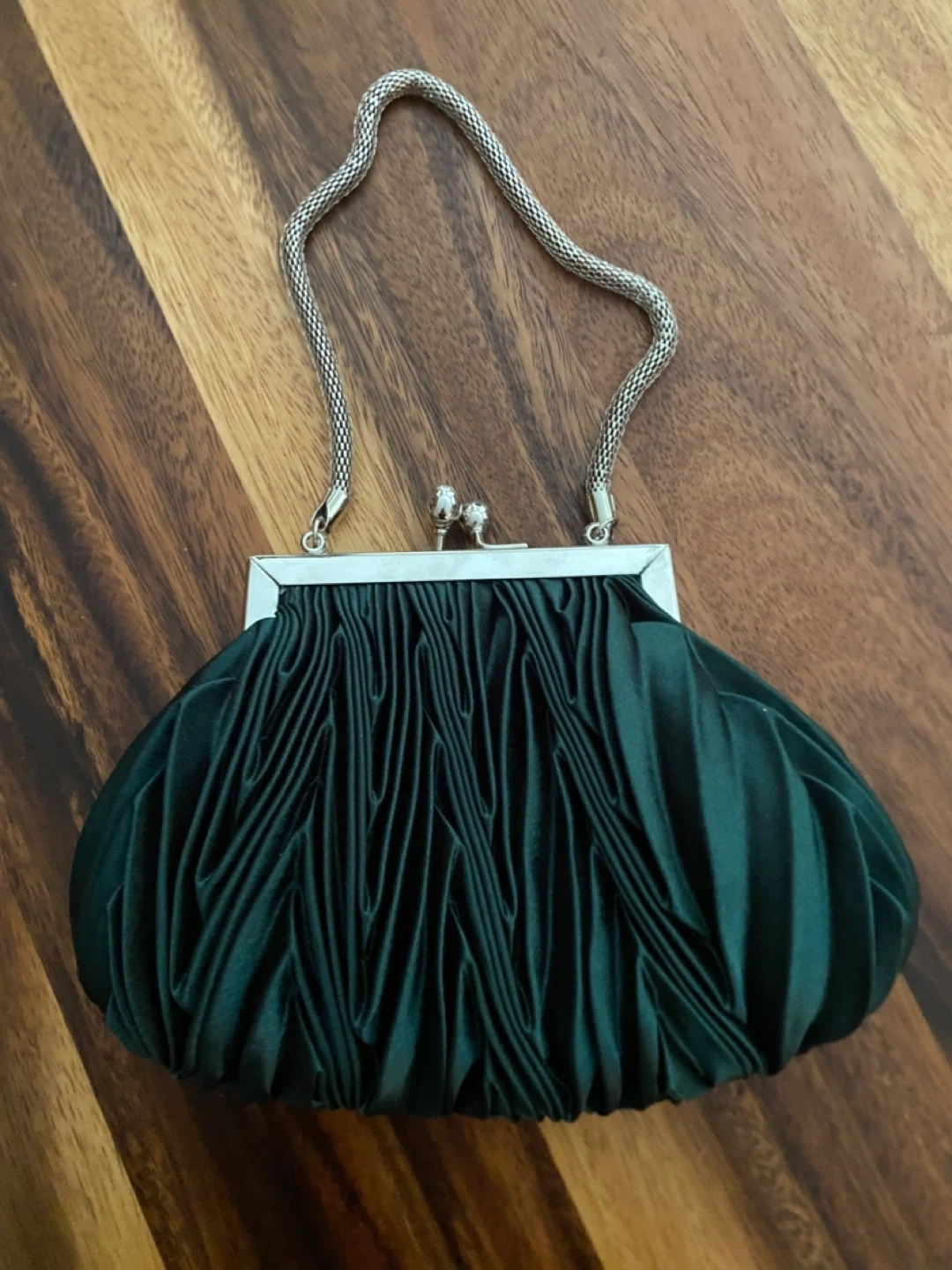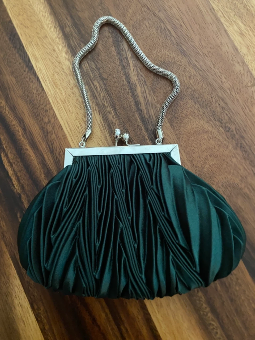 Selling a cute green satin evening bag. It features a silver frame and chain handle. Perfect for a night out!