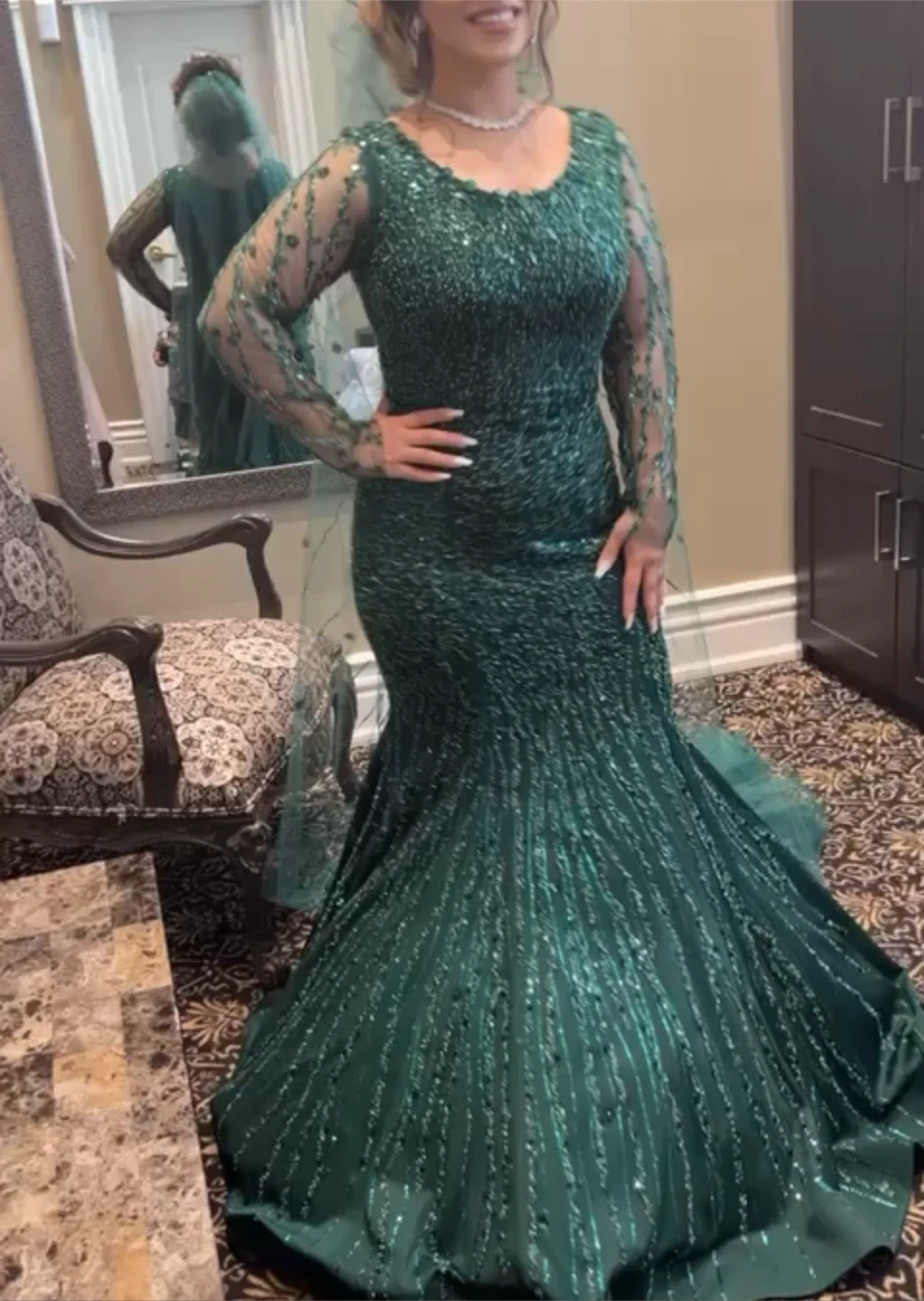 Beautiful green mermaid gown with sequin detailing. Perfect for a special occasion!