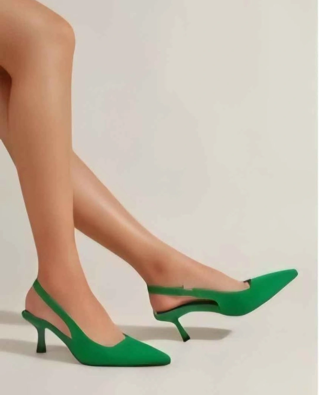 These vibrant green slingback heels are perfect for adding a pop of colour to your outfit! They feature a stylish kitten heel and a comfortable slingback strap. Great for dressing up or down!