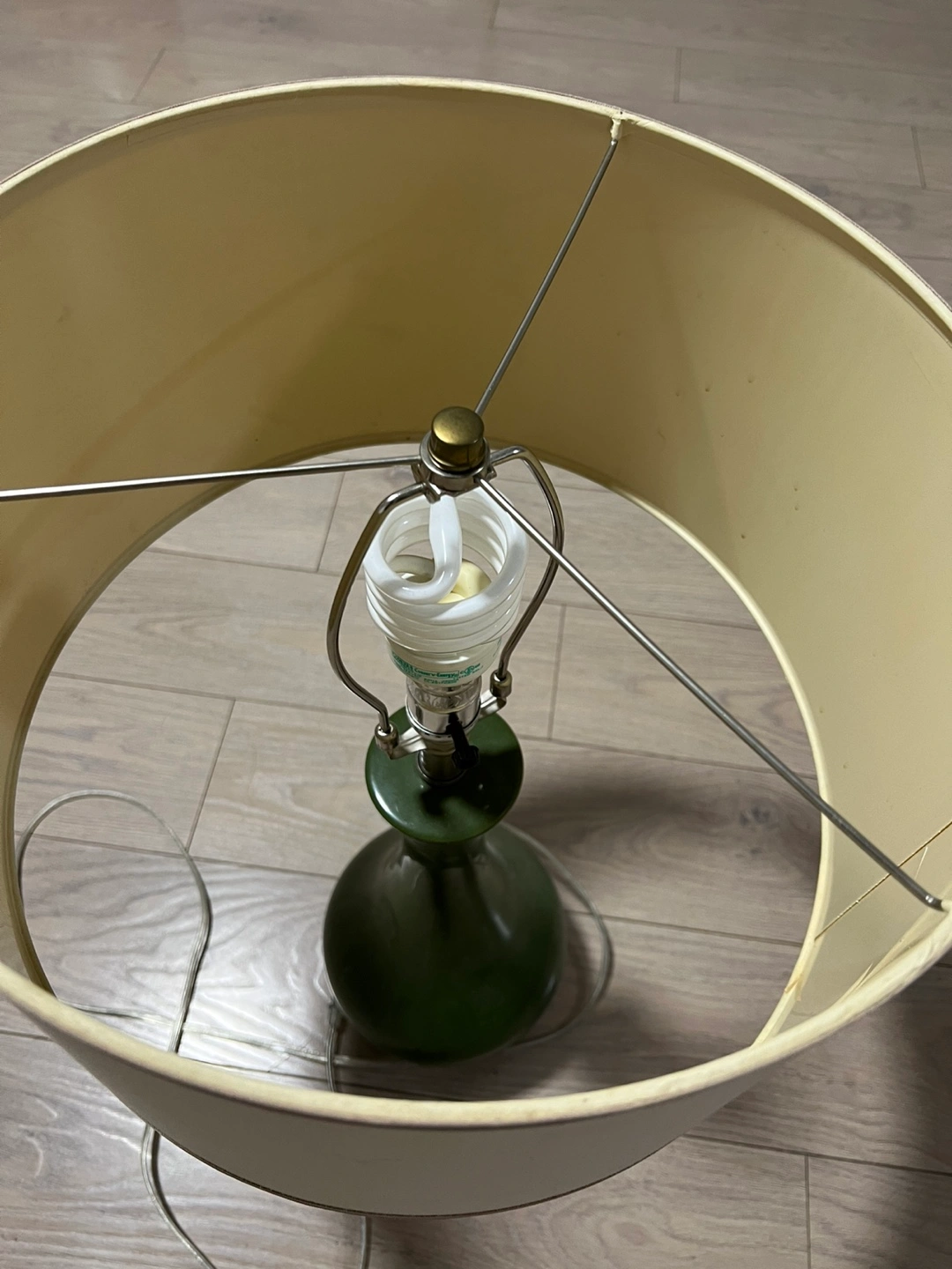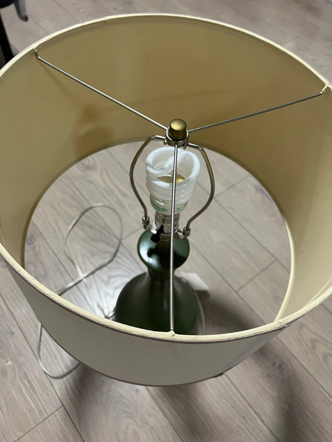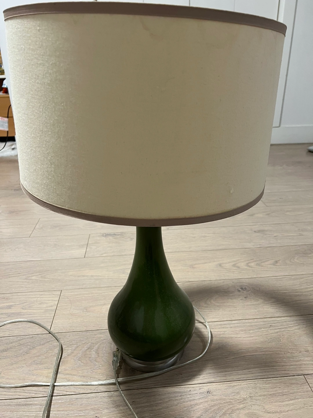 Selling a table lamp with a green base and a cream-coloured shade. It's in good condition and would look great in any room. The lamp includes a lightbulb, so it's ready to use right away!
