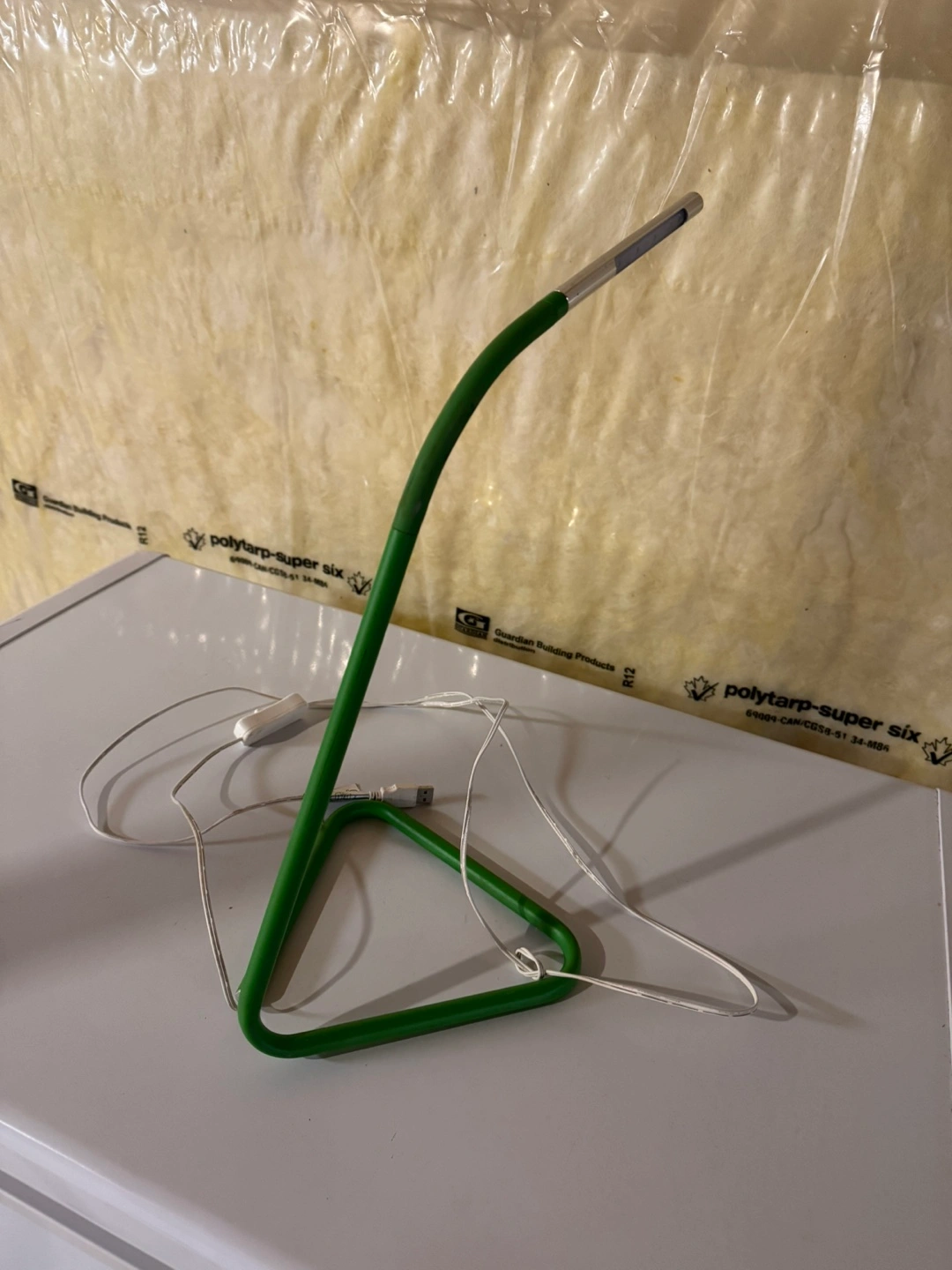 Flexible gooseneck LED desk lamp. USB powered. Green metal base. Simple on/off switch.