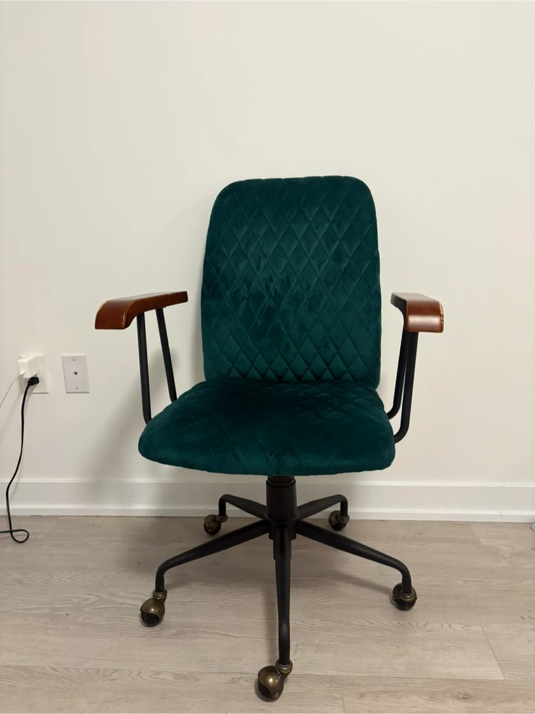 Selling a stylish green velvet office chair. It features a quilted design, wooden armrests, and a black metal base with caster wheels. A comfortable and attractive addition to any home office!