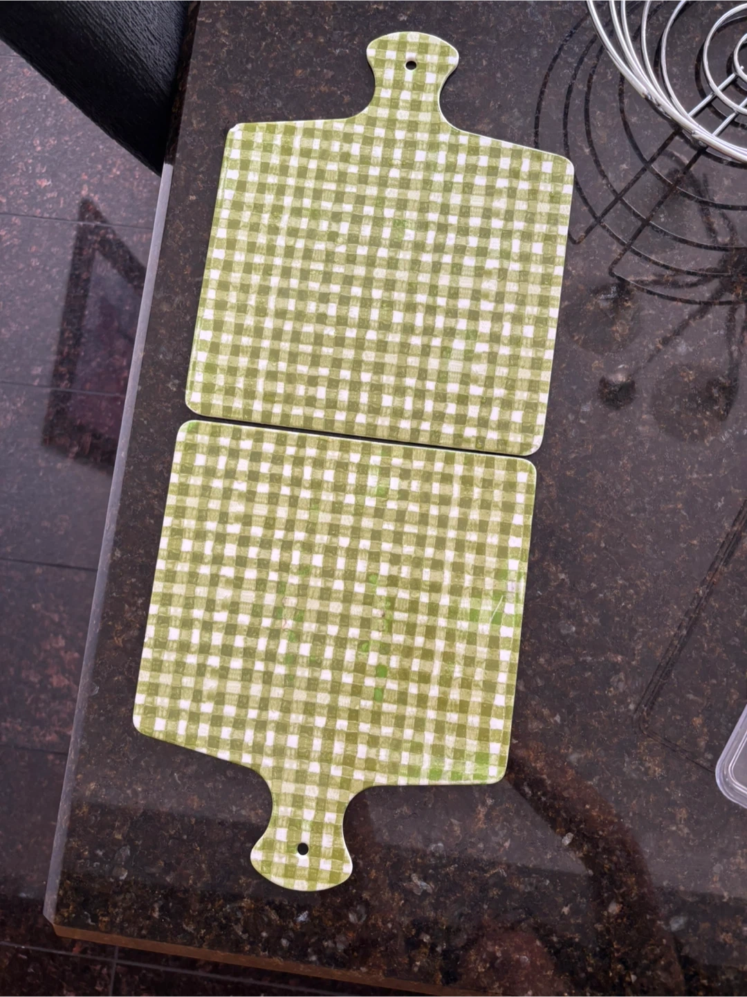 Two cutting boards/trivets with a green and white checkered pattern! They're in great shape and ready for a new home