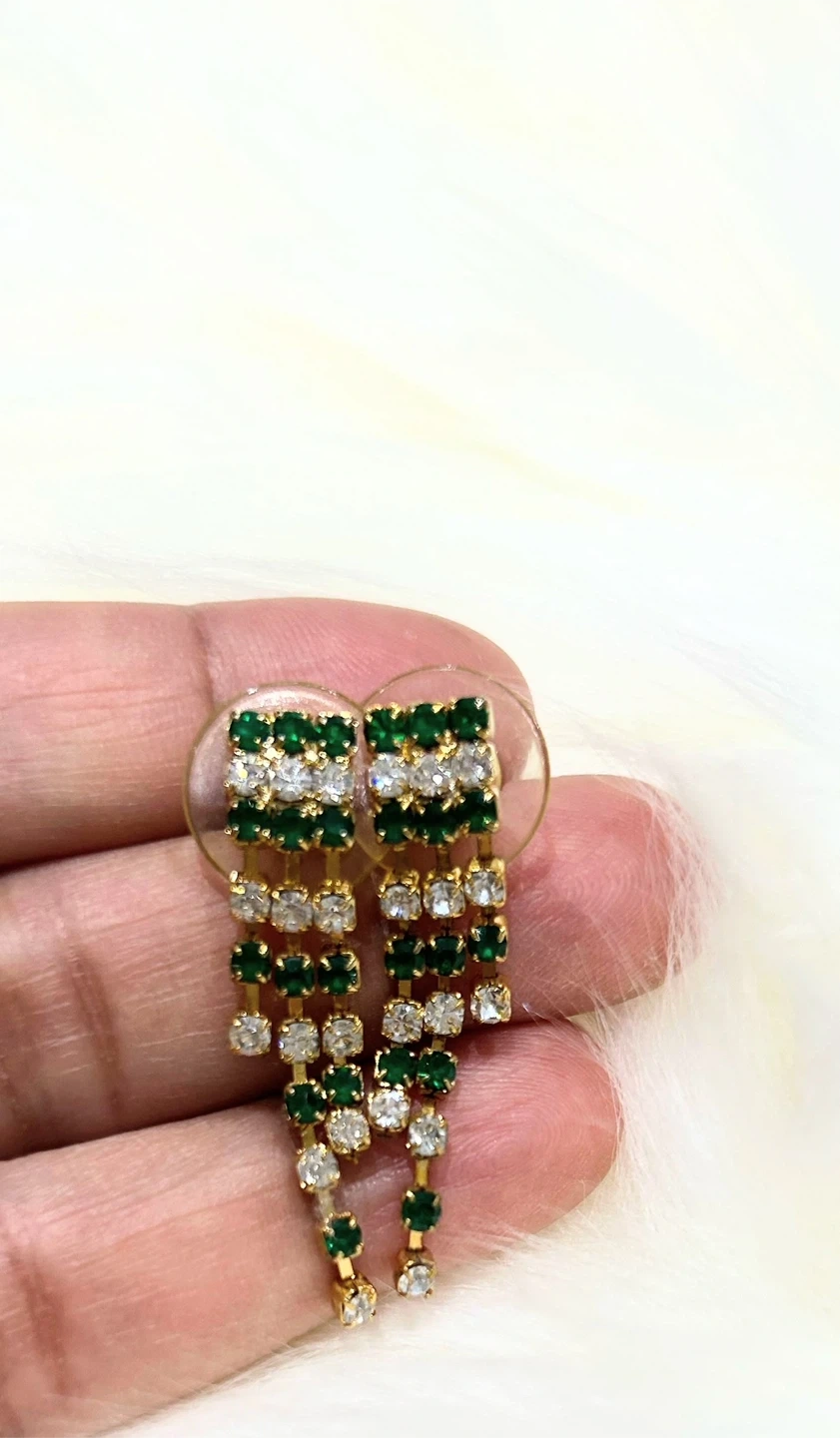 Here are some cute dangle earrings! They feature green and white stones set in a gold-tone metal setting. Perfect for small parties or gathering.