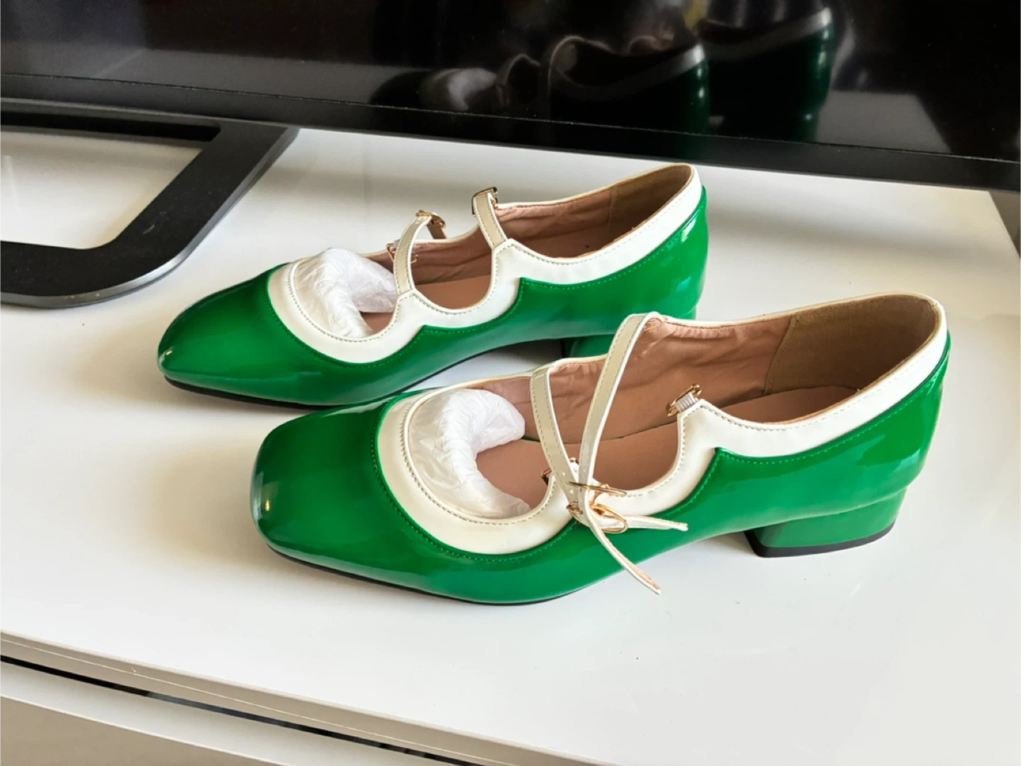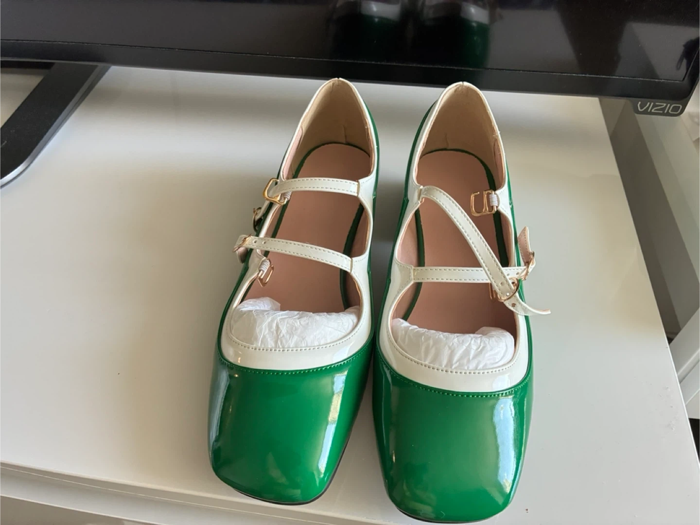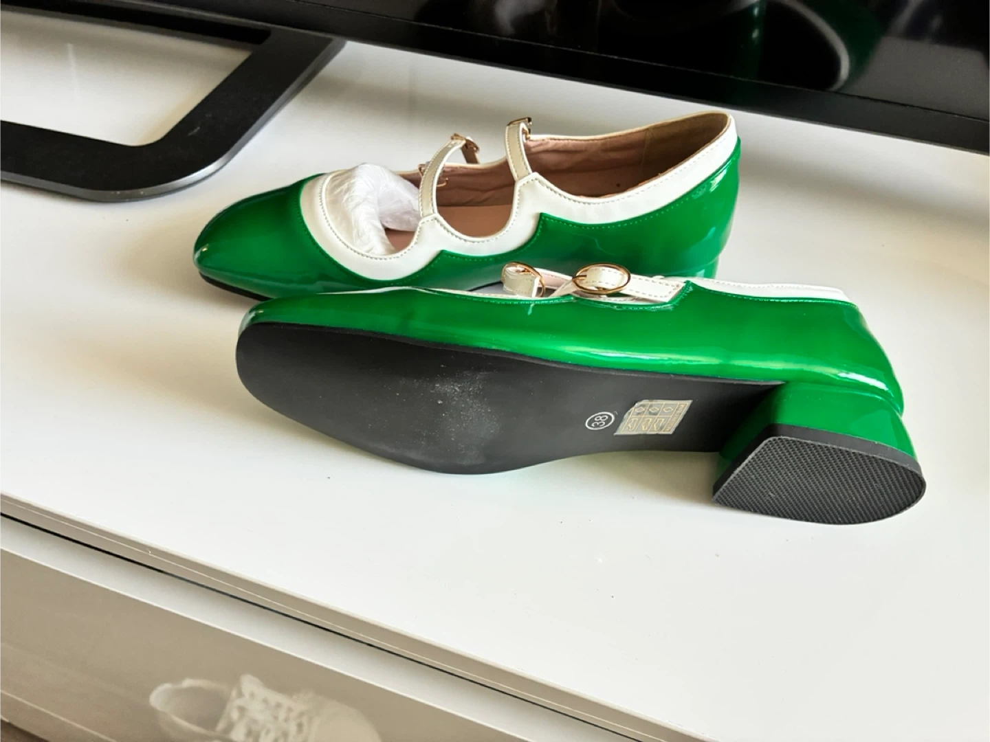 These adorable Mary Jane shoes are in a vibrant green and white colour combo! They're in great condition and ready for a new home. Size 38.