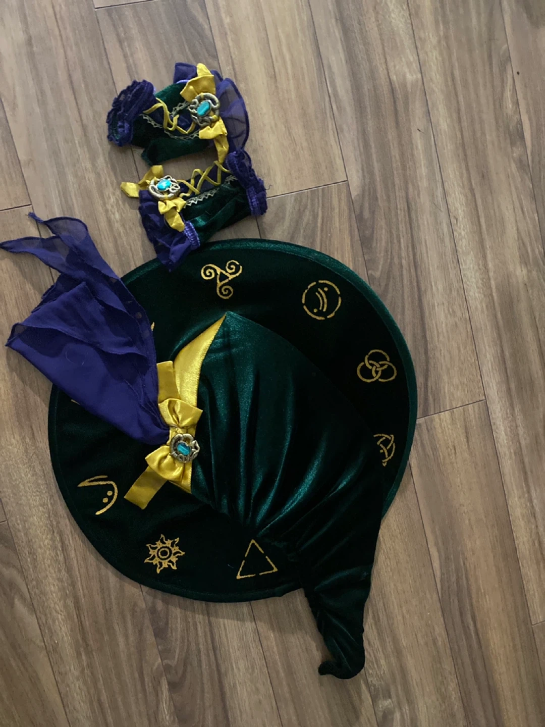 Hocus Pocus Selling a green witch costume hat with matching accessories. The hat is a dark green velvet material with gold detailing and a purple veil. It also comes with matching wrist fingerless gloves. Perfect for Halloween or costume parties!