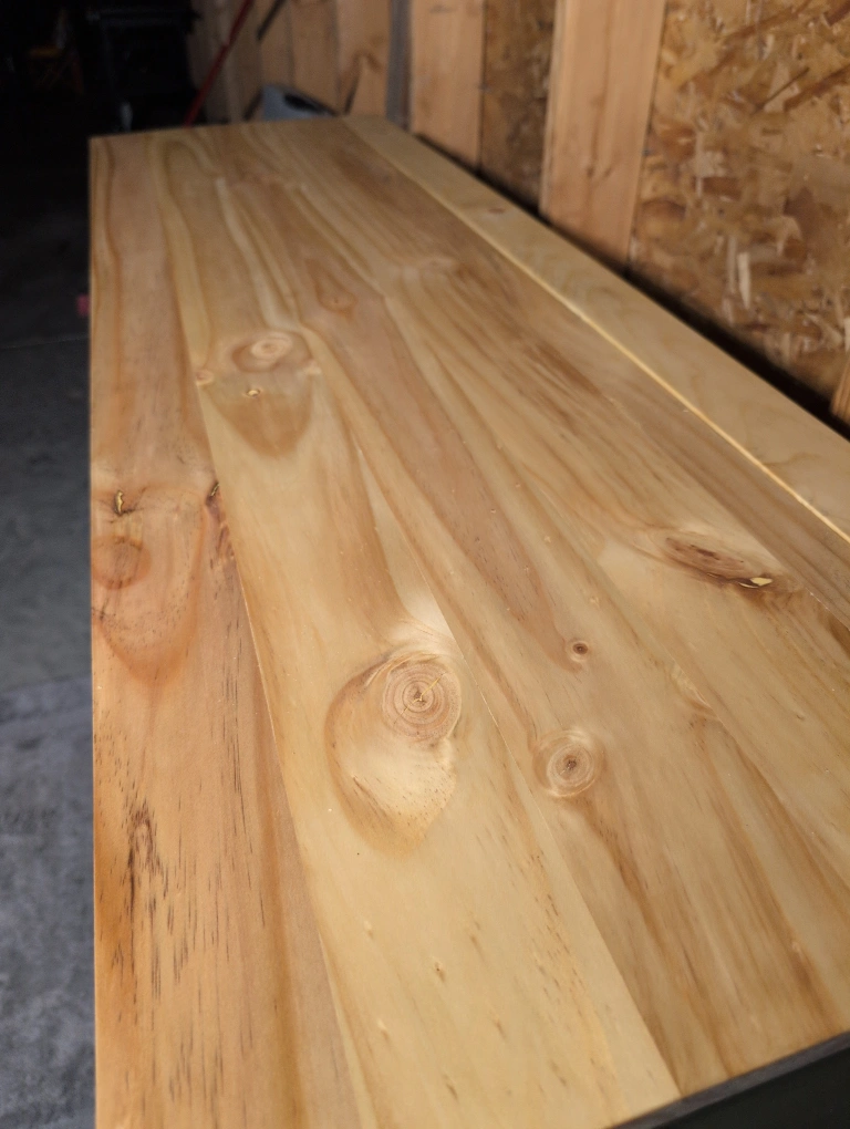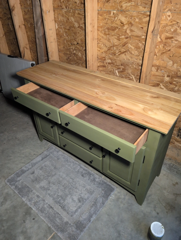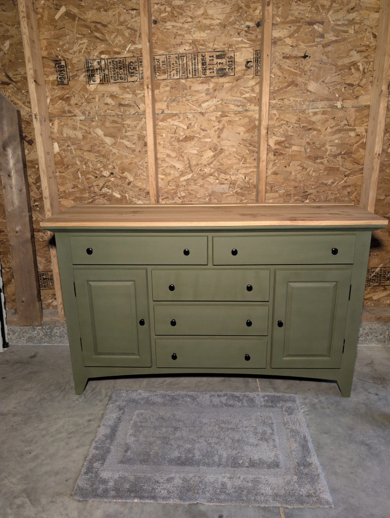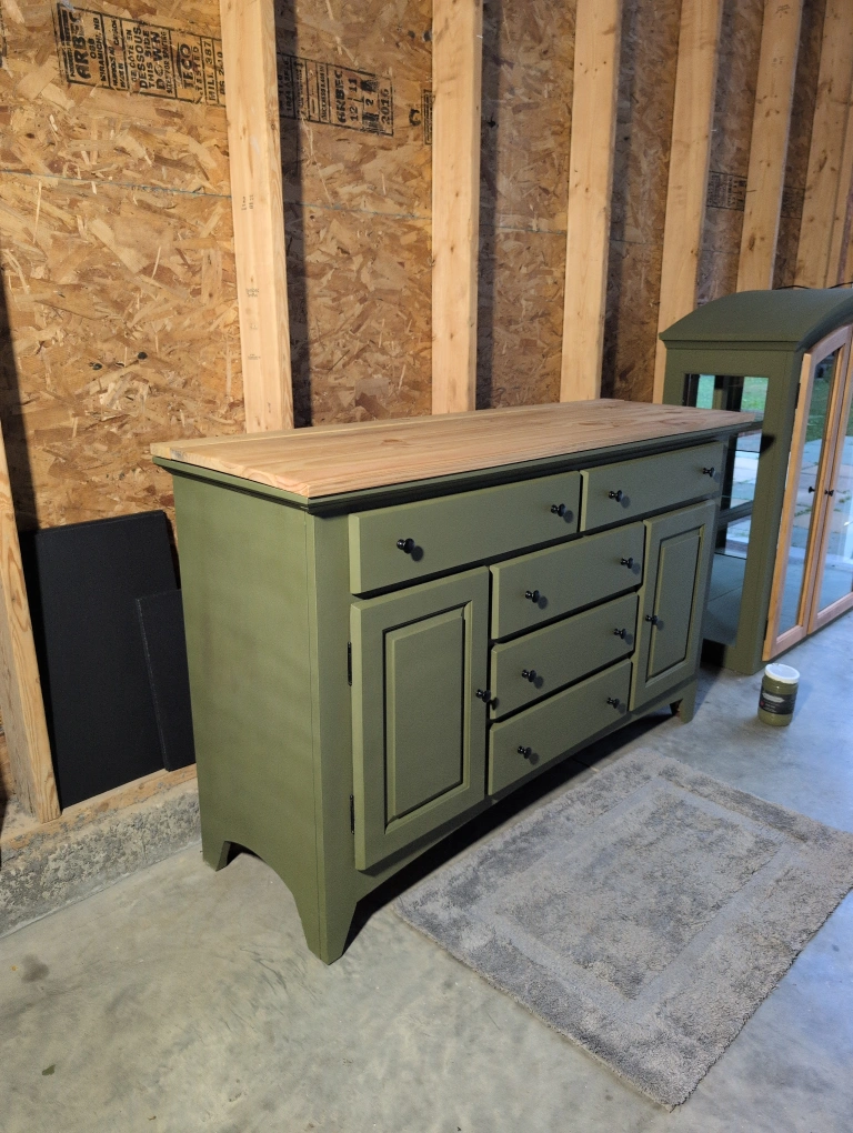 Here's a lovely green wood dresser with a natural wood top! It features several drawers and cabinet doors for ample storage. Perfect for adding a touch of rustic charm to any room in your home