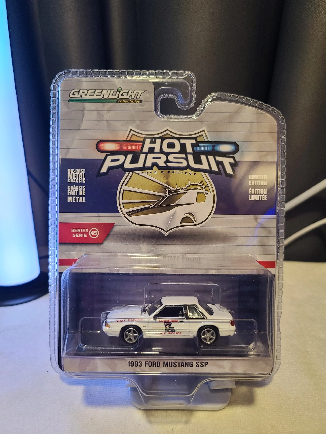 Selling a Greenlight Collectibles die-cast metal chassis car, a 1993 Ford Mustang SSP from the Hot Pursuit series. It's still in its original packaging and part of the limited edition series!