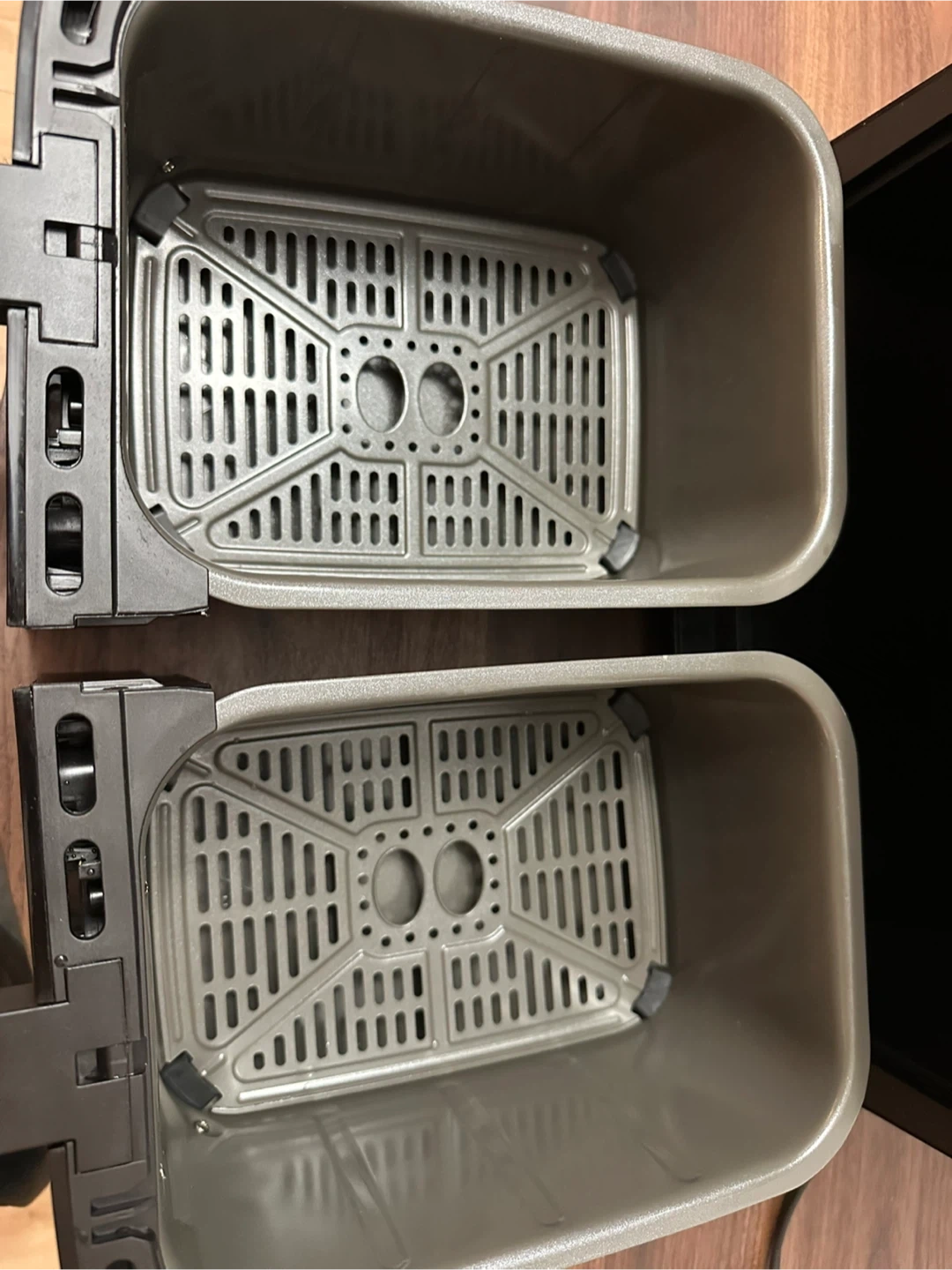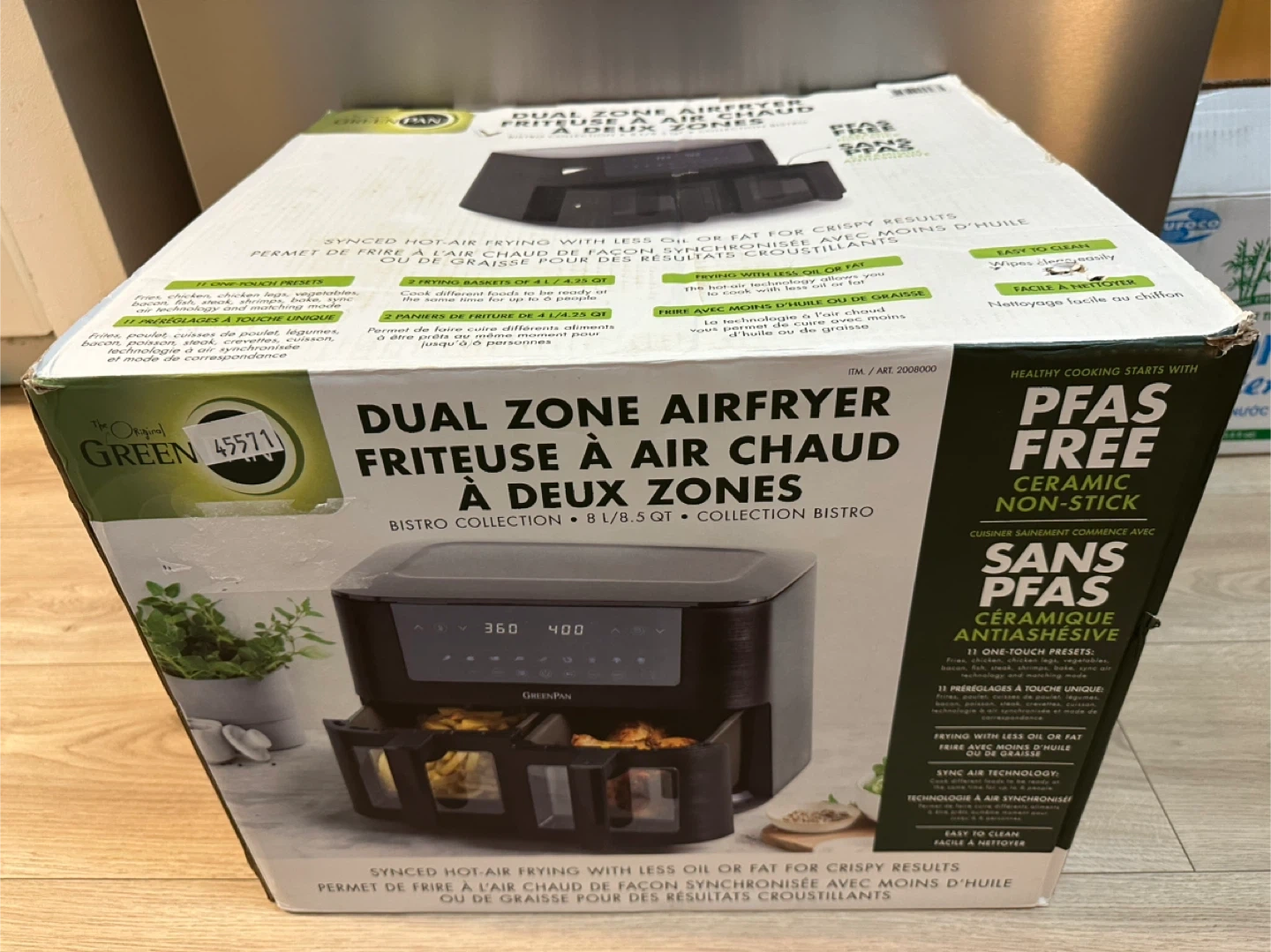 Selling a GreenPan dual zone air fryer in excellent condition! This air fryer has two separate zones, each with a capacity of 8 L / 8.5 Qt. It features ceramic non-stick coating that is PFAS free for healthy cooking. The synced hot-air frying ensures crispy results with less oil or fat. It's easy to clean too!