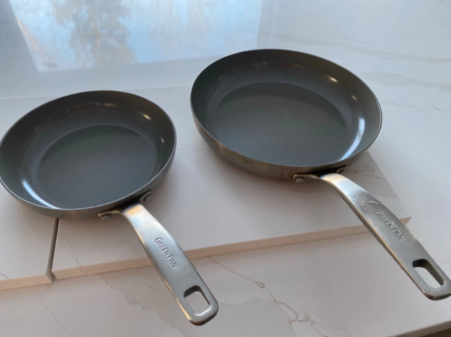 Two GreenPan frying pans for sale, 25 firm. It comes with high quality Stainless steel handles and in very good condition. Purchased from Amazon for 70+. This ceramic coating is free of PFAS and PFOA. Pick up at Thornhill. Here is some description from Amazon: SET INCLUDES: 8” frypan and 10” frypan REINFORCED WITH DIAMONDS: Metal utensil safe, GreenPan's original diamond-infused nonstick coating offers remarkable durability, balanced heating, and effortless cleanup. TOXIN-FREE: GreenPan's Thermolon healthy ceramic nonstick coating is free of PFAS, PFOA, lead, and cadmium