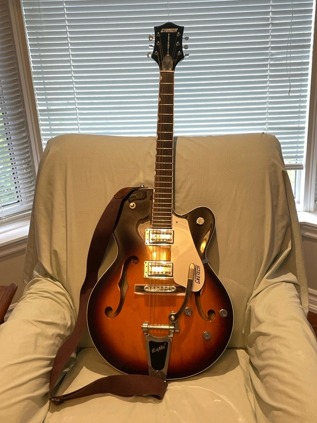 Up for sale is a gently played Grestch Electromatic 5120 in sunburst orange/yellow fading to dark brown/black at the perimeter. It has a Bigsby tremolo. It sounds nice, everything works as it should. There’s still packaging foam under the bridge. Thinning out the herd as I have less time to play. Also have my Fender acoustasonic 15 practice amp (also very lightly used-for $150). Everything works. $875 Located near Orangeville. Can meet in town.