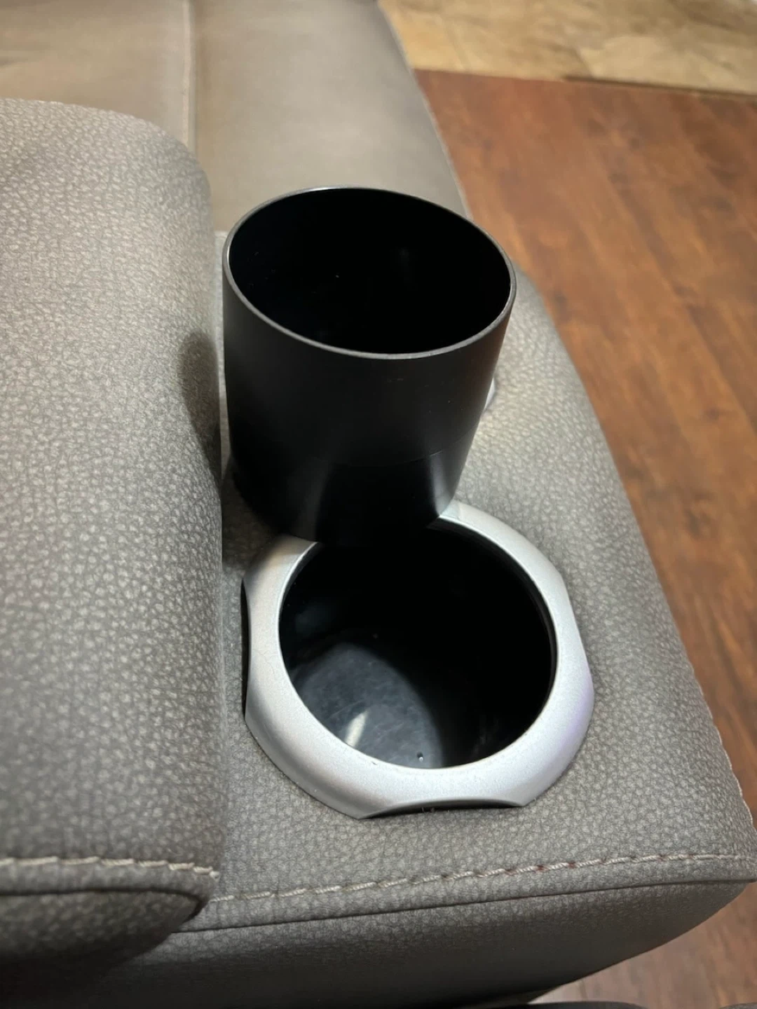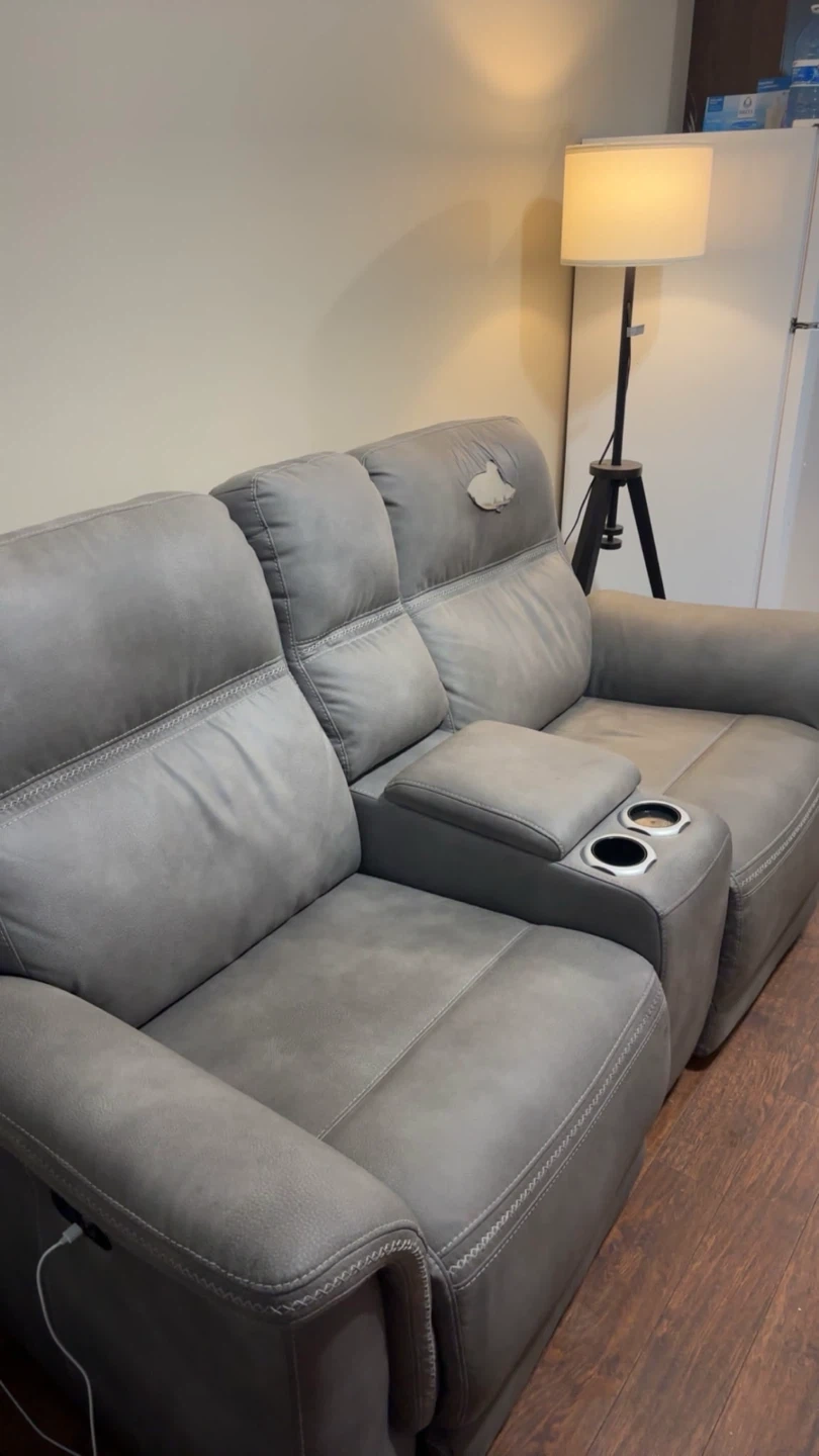 Selling a comfy grey two-seat reclining loveseat! It features a centre console with cupholders and a storage compartment. There is some wear and tear on one of the headrests, as shown in the pictures. Otherwise, it's in good condition and ready for a new home! Grey reclining loveseat Leg recline and head recline Both seats recline perfectly 2 cup holders, With removable double-sided cup holders for hot and cold beverages. USB connection on each sides, great for charging phones. Storage in the middle, plenty of space for remotes and charging cables. Original price was 3000$. Very well made recliner, due to the slight damage on the headrest we are selling it for cheap. We just don't have the space to store it anymore. Very comfortable, Unfortunately The leather on the headrest on one of the chairs is peeling off But could be easily covered up with a seat/ sofa cover or with a faux leather patch.