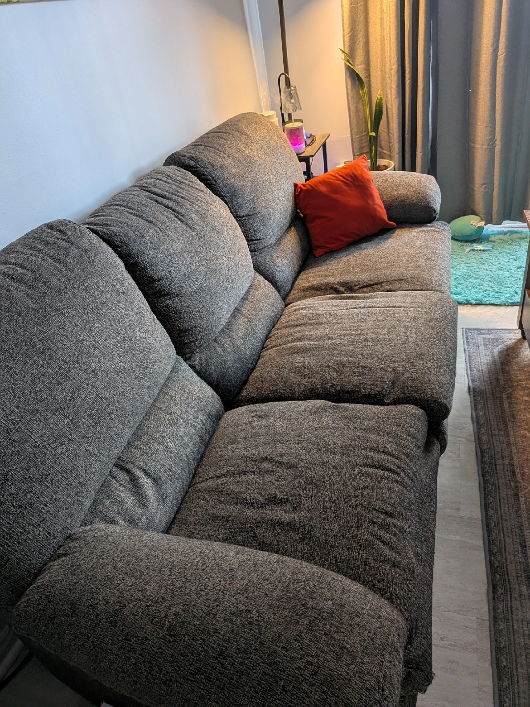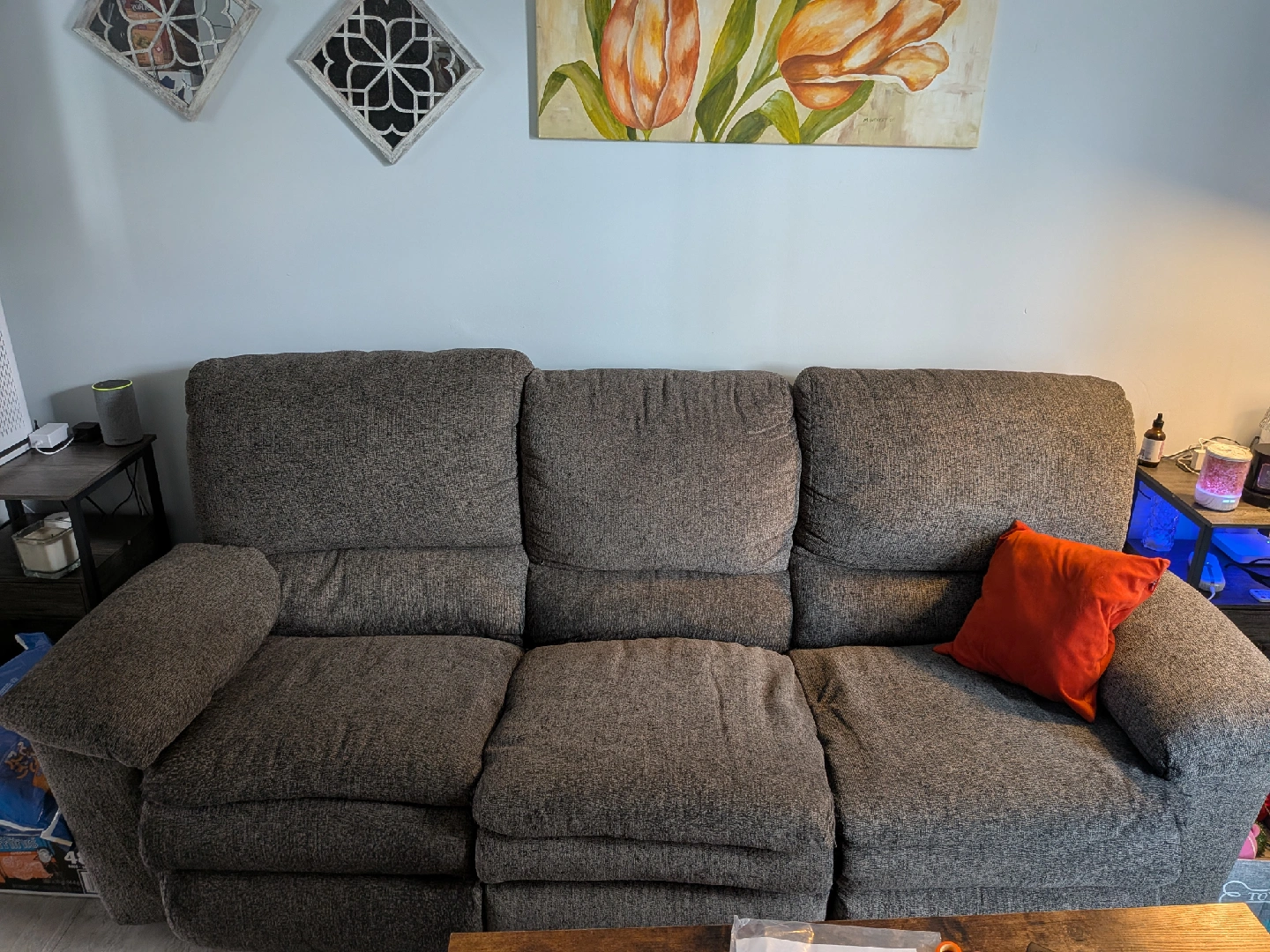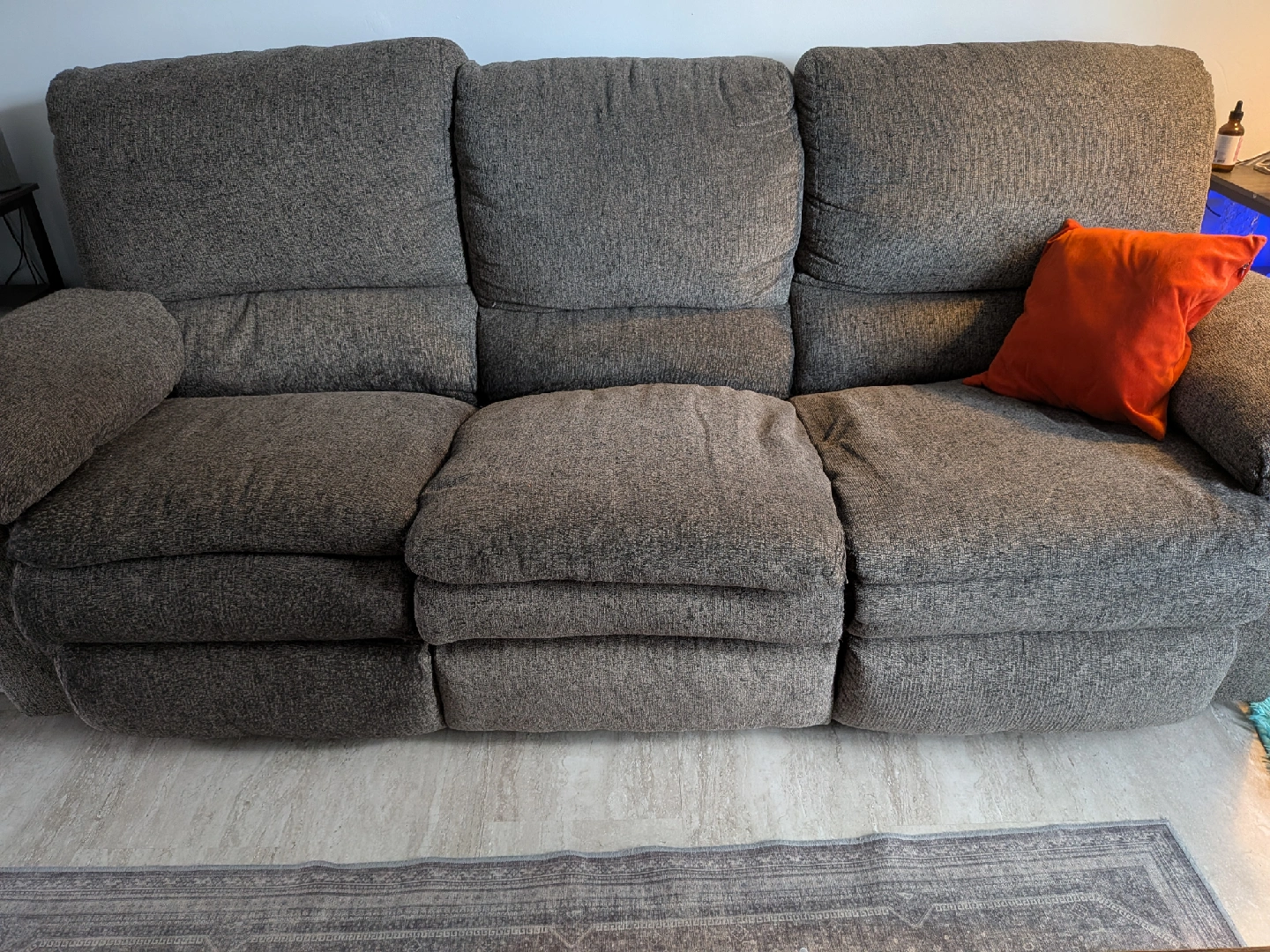 Cozy and durable 3-seat reclining sofa in great shape. All seats are plush and comfortable, perfect for relaxing, movie nights, or everyday use. The neutral dark gray fabric fits easily with any décor. Recliners work smoothly, and the couch is clean and well cared for. 🛋️ Features: 3 roomy seats (2 recline) Soft, textured fabric upholstery Very comfortable and supportive 📏 Approximate size: 85" long × 38" deep × 40" high 💰 Price: $280 OBO (reasonable offers welcome)
