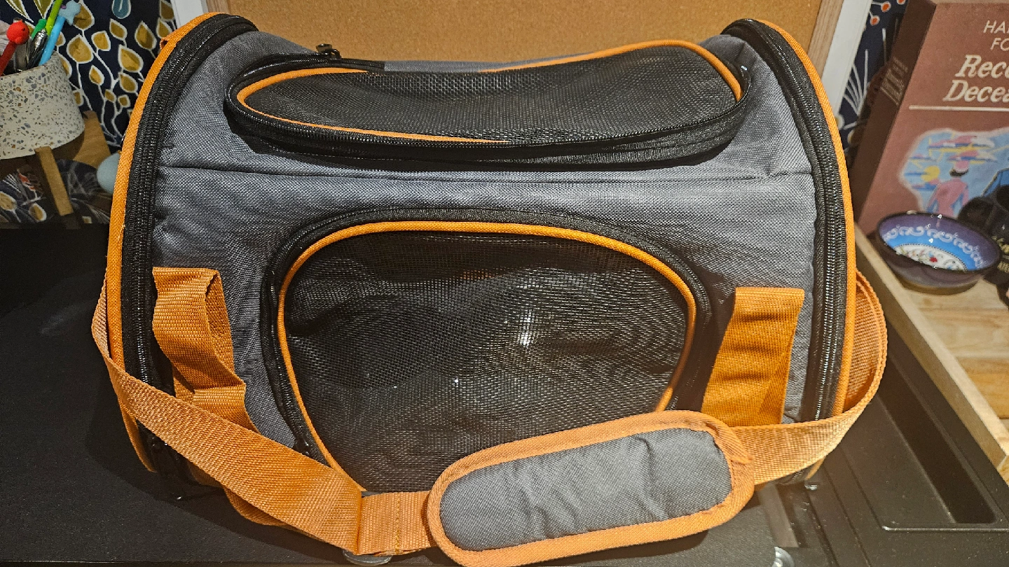 Selling a pet carrier in great shape! It's grey and orange, perfect for taking your furry friend on adventures or to the vet. It has mesh windows for ventilation and a comfortable shoulder strap for easy carrying. Zippers on both top and bottom. Barely used.