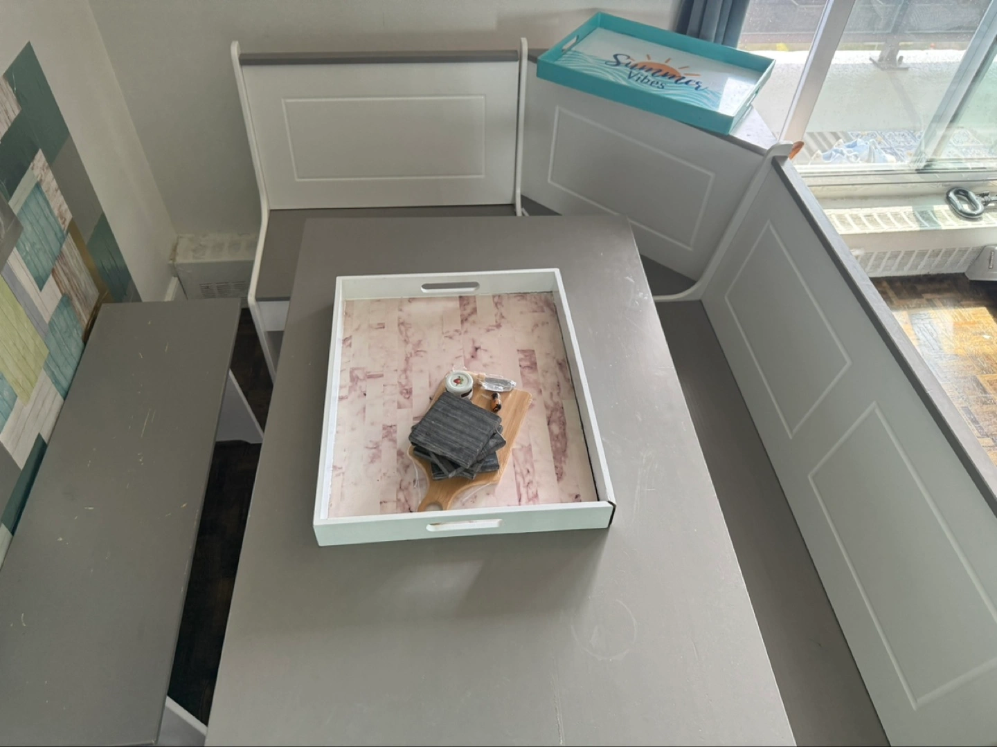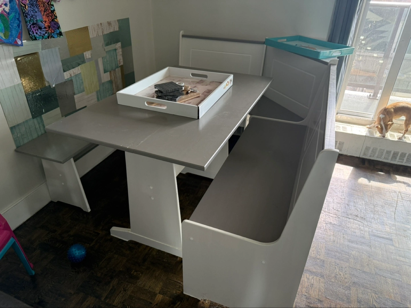Cute kitchen nook set. Grey table and benches. White trim. Perfect for small spaces. Some minor wear.