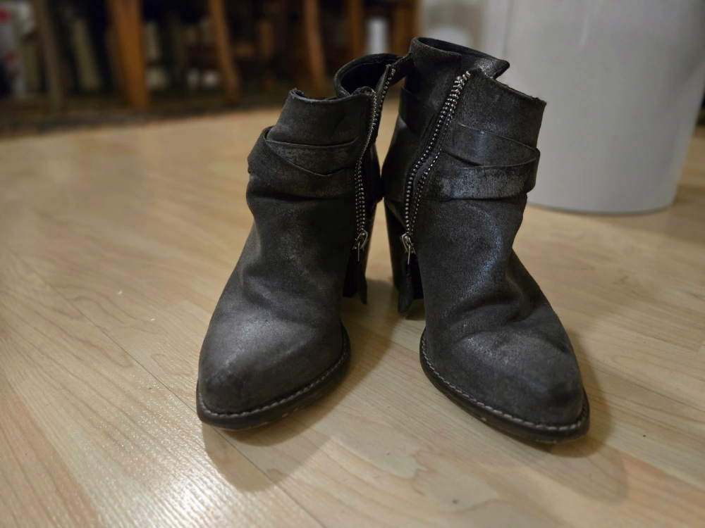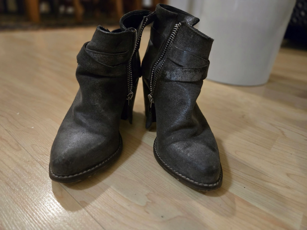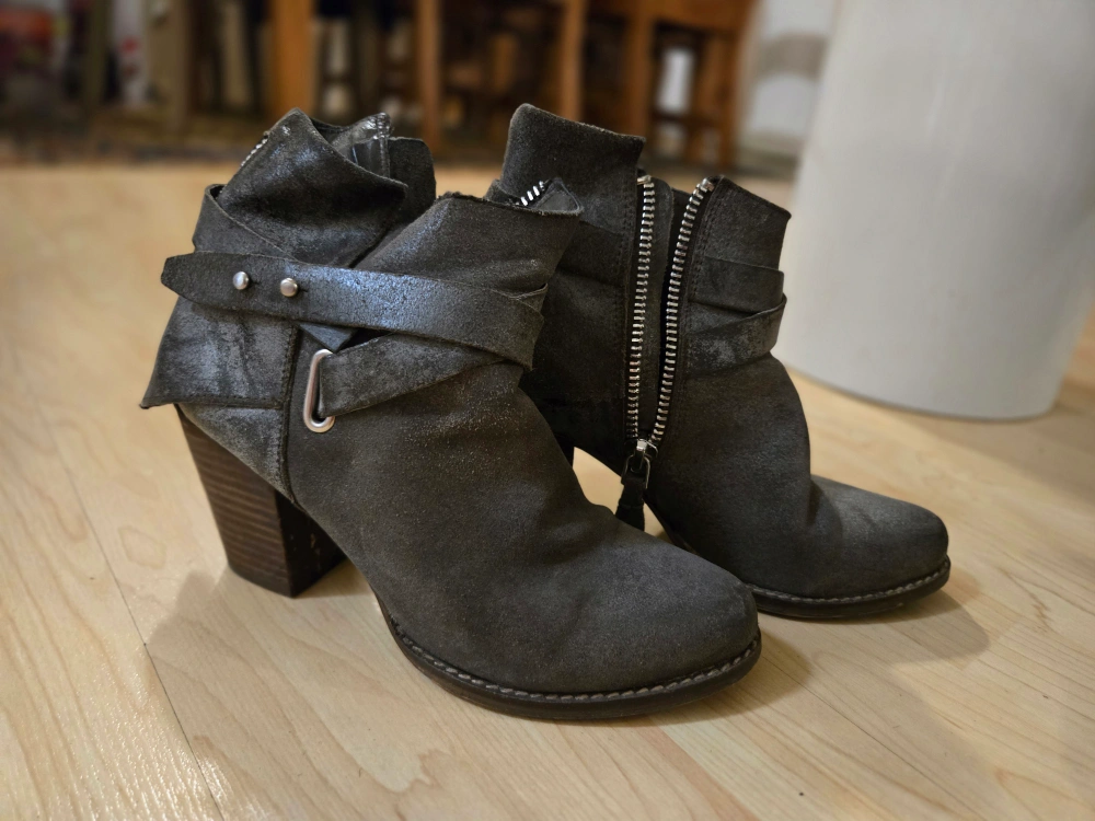Selling a pair of grey ankle boots in size 7. They feature a stylish wrap-around strap and a convenient side zipper. Perfect for adding a bit of edge to your outfit! Reason of Selling: I am moving to new place. Only available for pick up.
