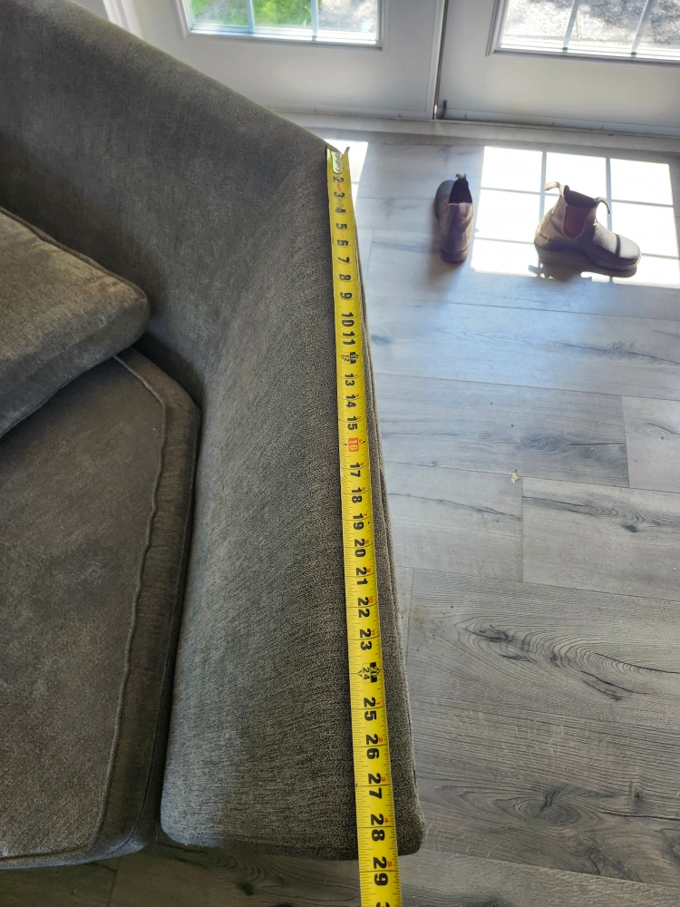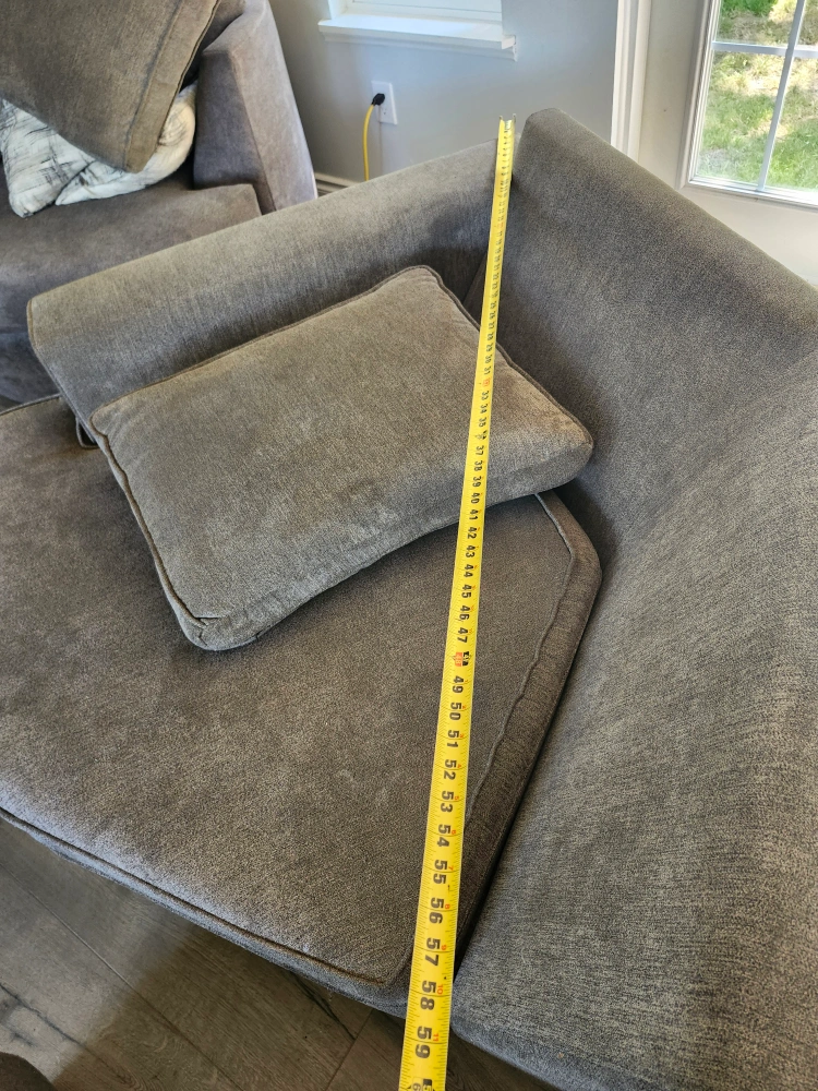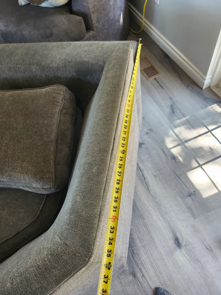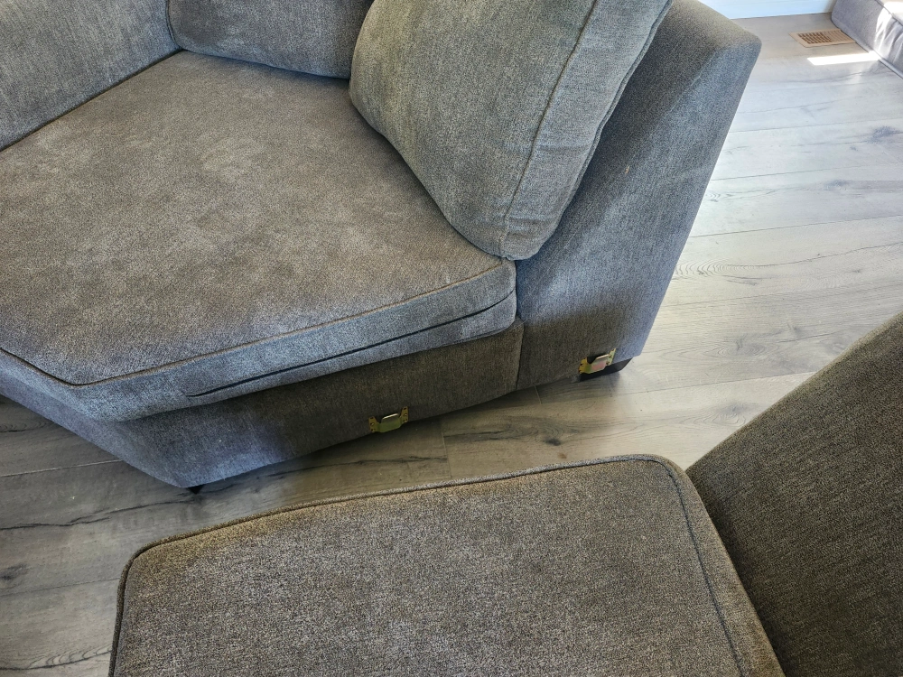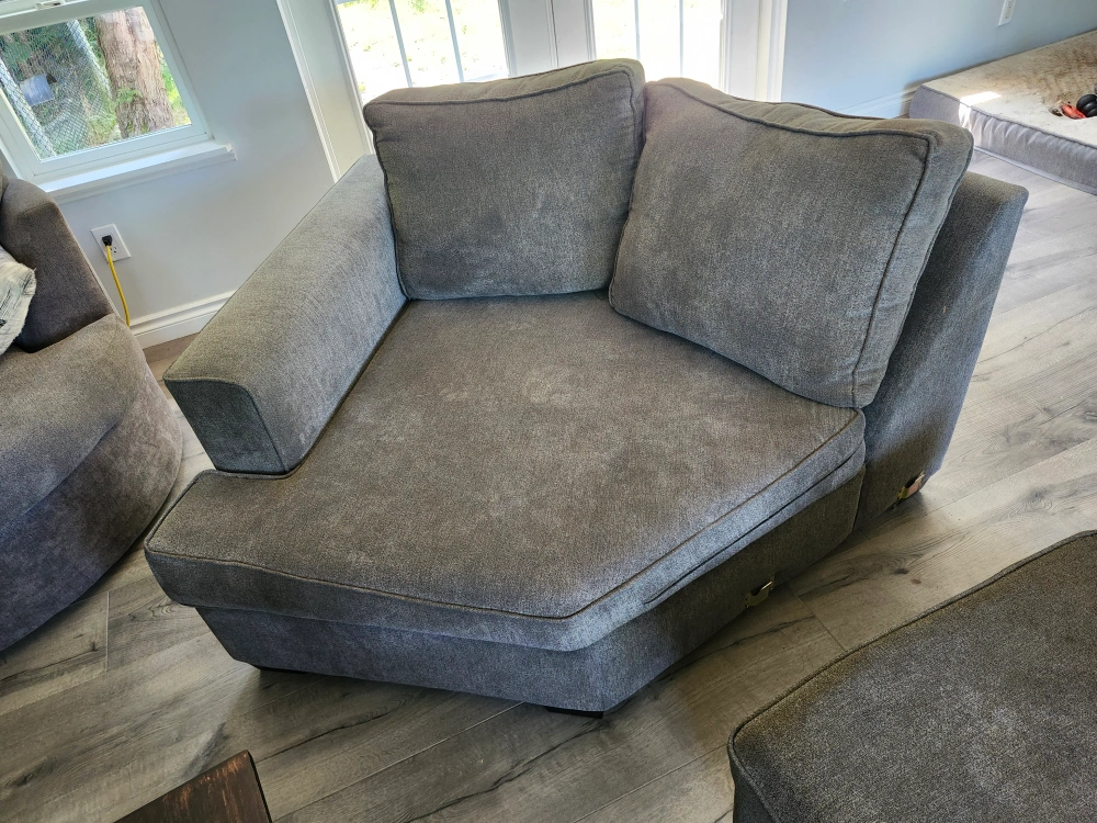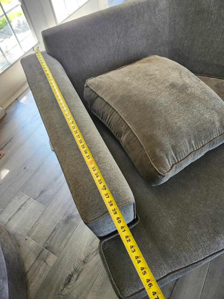 Selling a comfy grey armchair.The armchair is in great shape and is super comfortable measurements are in photos, this was actually the end piece of the sectional in the last photo but it won't fit in my new space. I will remove the hooks on the side shown in one photo before pickup. pet friendly home