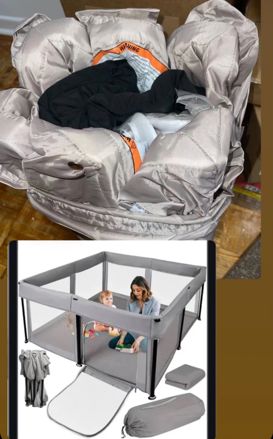 Foldable playpen, grey fabric. Includes storage bag and mat. Easy to assemble and store.
