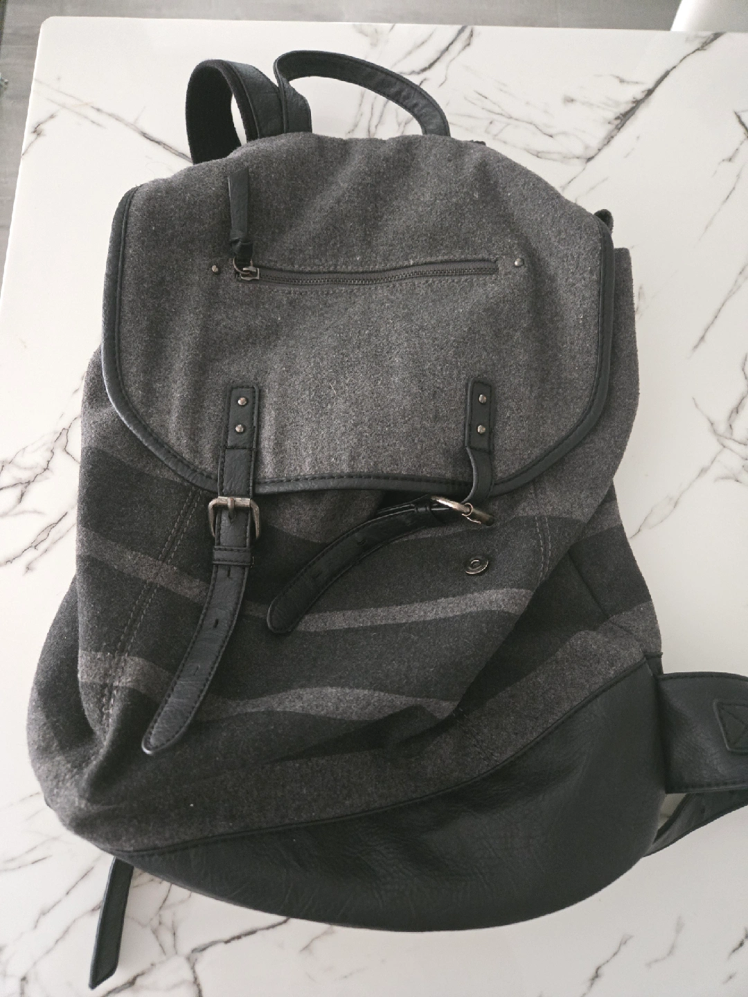 Stylish grey and black backpack in good condition! It features a flap closure with buckle detailing and a zippered pocket on the flap. The bottom portion is made of a leather-like material, adding a nice contrast to the grey fabric.