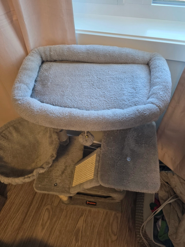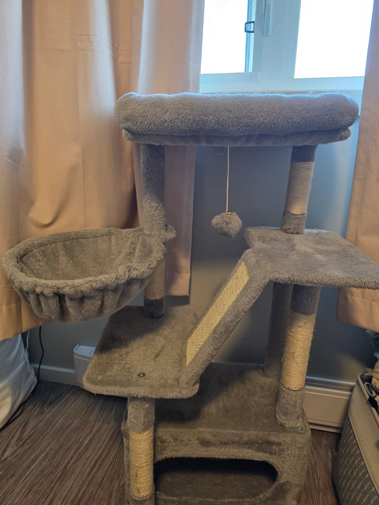 Selling a cat tree in great condition! It's grey and features a scratching post, a cozy basket, and multiple platforms for your cat to explore. It's perfect for keeping your furry friend entertained and active indoors