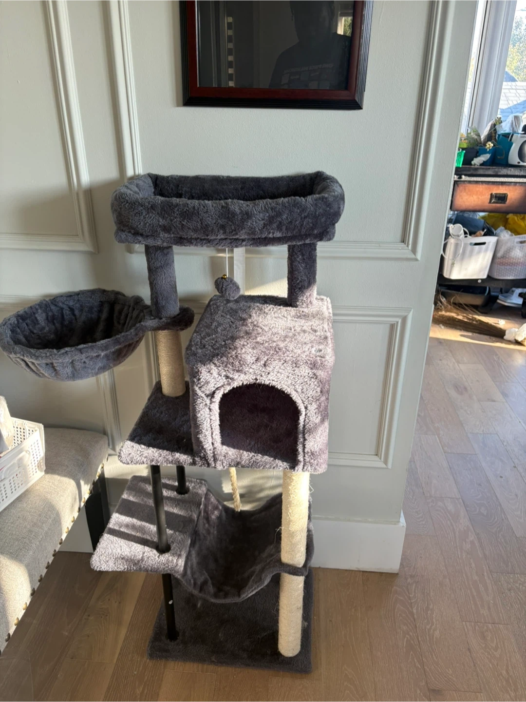 Here’s a cozy cat tree, perfect for your feline friend! It features multiple levels for climbing, a comfy condo for napping, and scratching posts to keep those claws happy. It’s in great condition and ready for a new home!