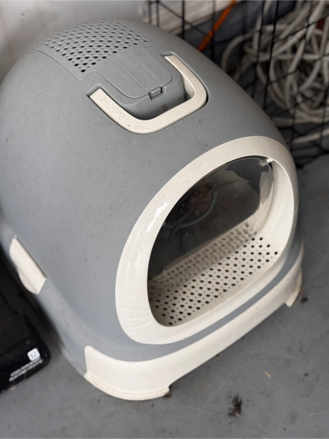 Selling a grey covered cat litter box. It's in used condition but still has a lot of life left in it! It's perfect for keeping litter contained and reducing odours. The enclosed design gives your cat some privacy too