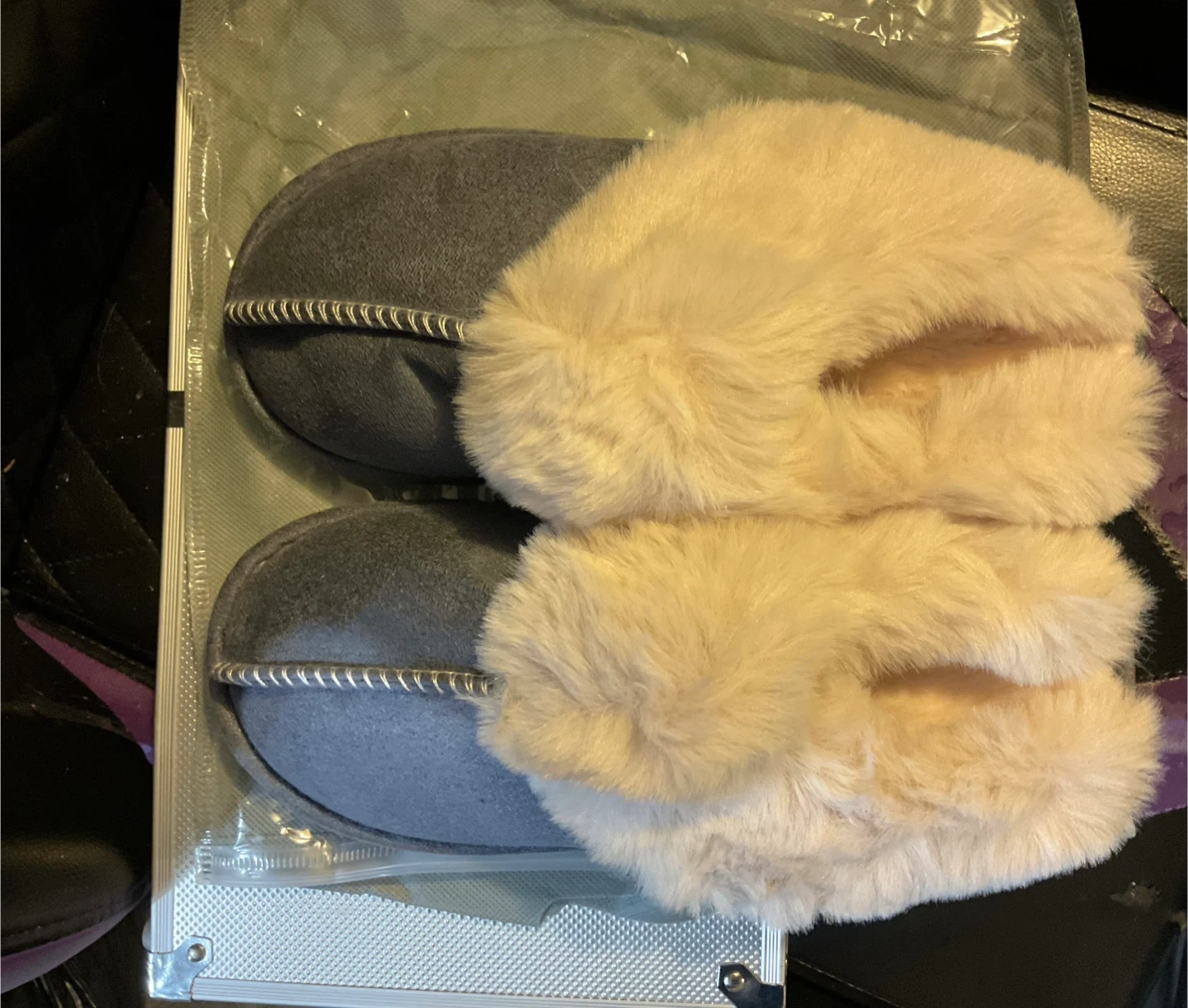Cozy up with these comfy slippers! They feature a soft grey base and a fluffy cream-coloured faux fur trim. Perfect for keeping your feet warm on chilly days size 40/41
