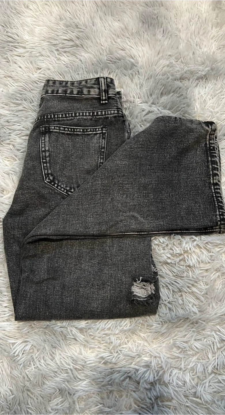 Selling a pair of grey jeans with a distressed detail on one leg. They're in great condition and ready for a new home!
