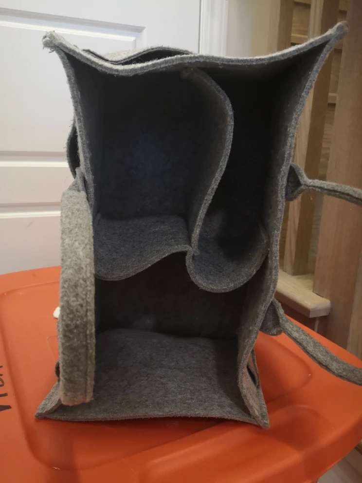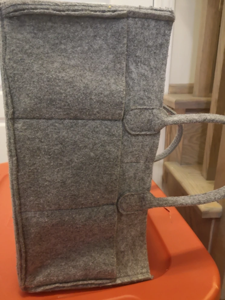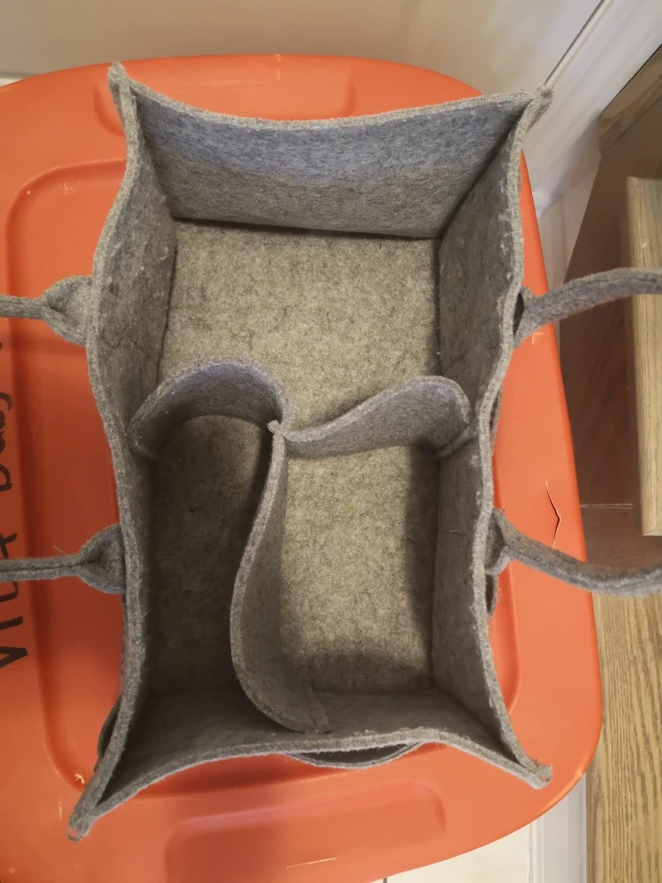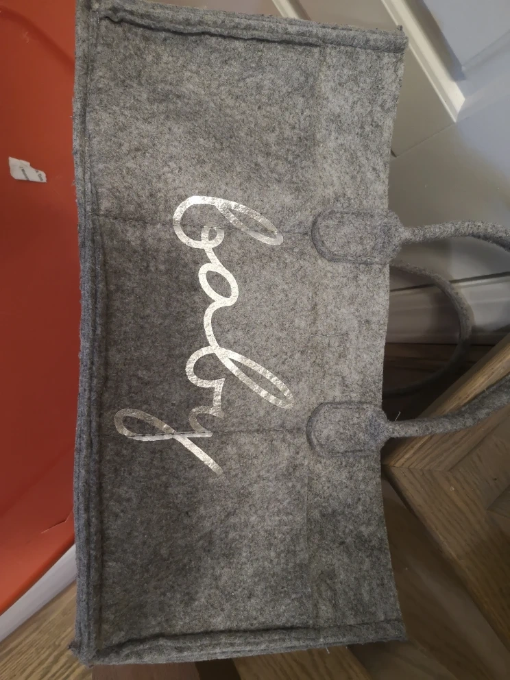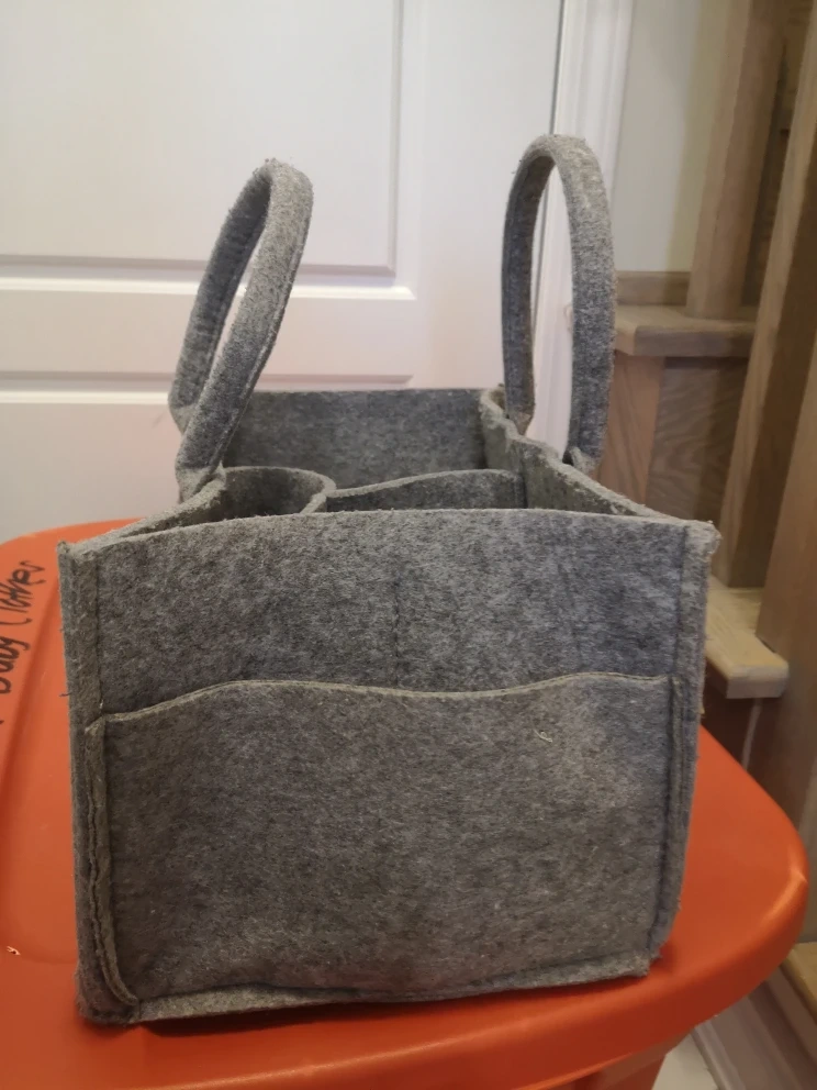 Selling a grey felt baby bag tote. It has a few compartments inside and pockets on the outside. This tote is perfect for organizing baby essentials!