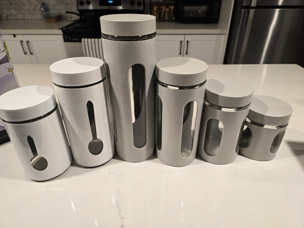 Selling a set of 6 grey food storage containers. They come in various sizes to suit your needs. Perfect for organizing your pantry or kitchen cabinets!