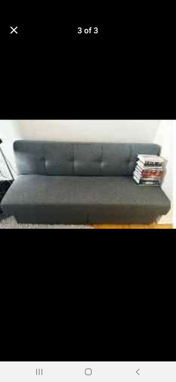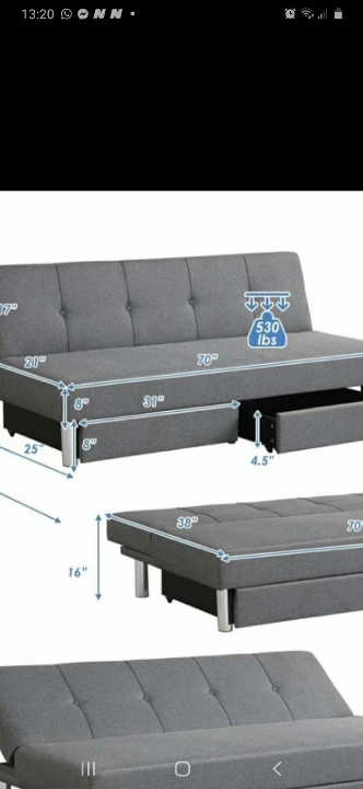 This grey futon sofa bed is in excellent condition! It easily converts from a sofa to a bed, making it perfect for guests or small spaces. It features a sleek design and comfortable cushioning. Dimensions are shown in the photos. A great addition to any living room or guest room!