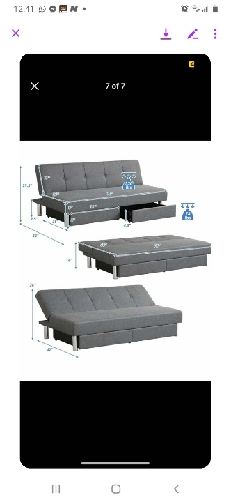 Selling a grey futon sofa bed, perfect for a small space or spare room! It easily converts from a sofa to a bed. It also includes storage drawers underneath for extra convenience! The dimensions are 70" wide, 32" deep, and 29.5" high when in sofa form. When flat as a bed, it's 70" wide and 38" deep