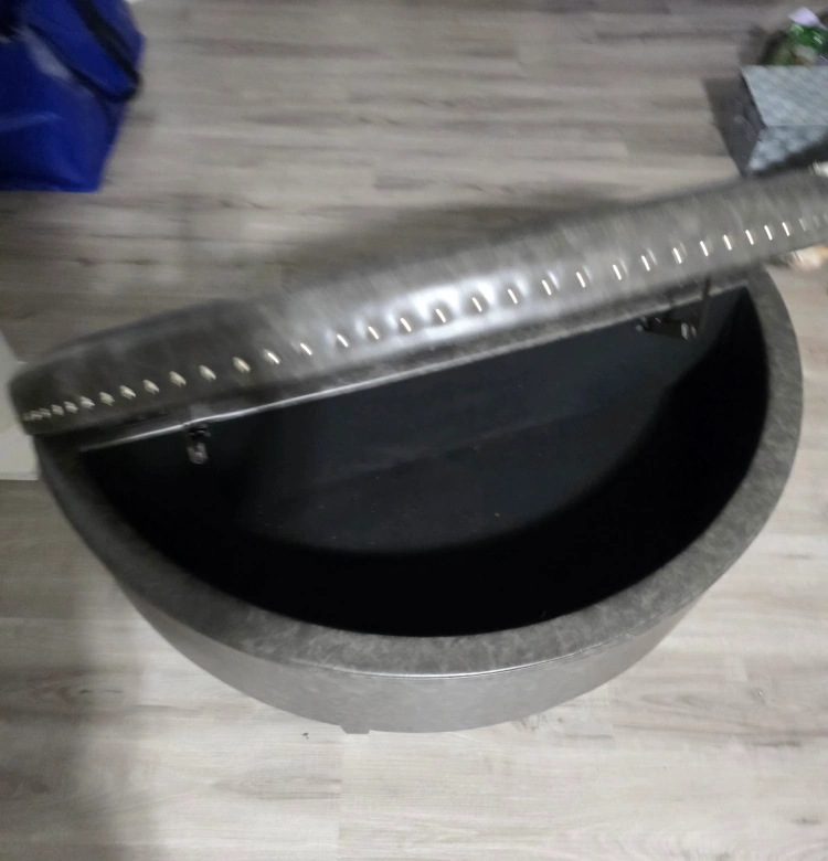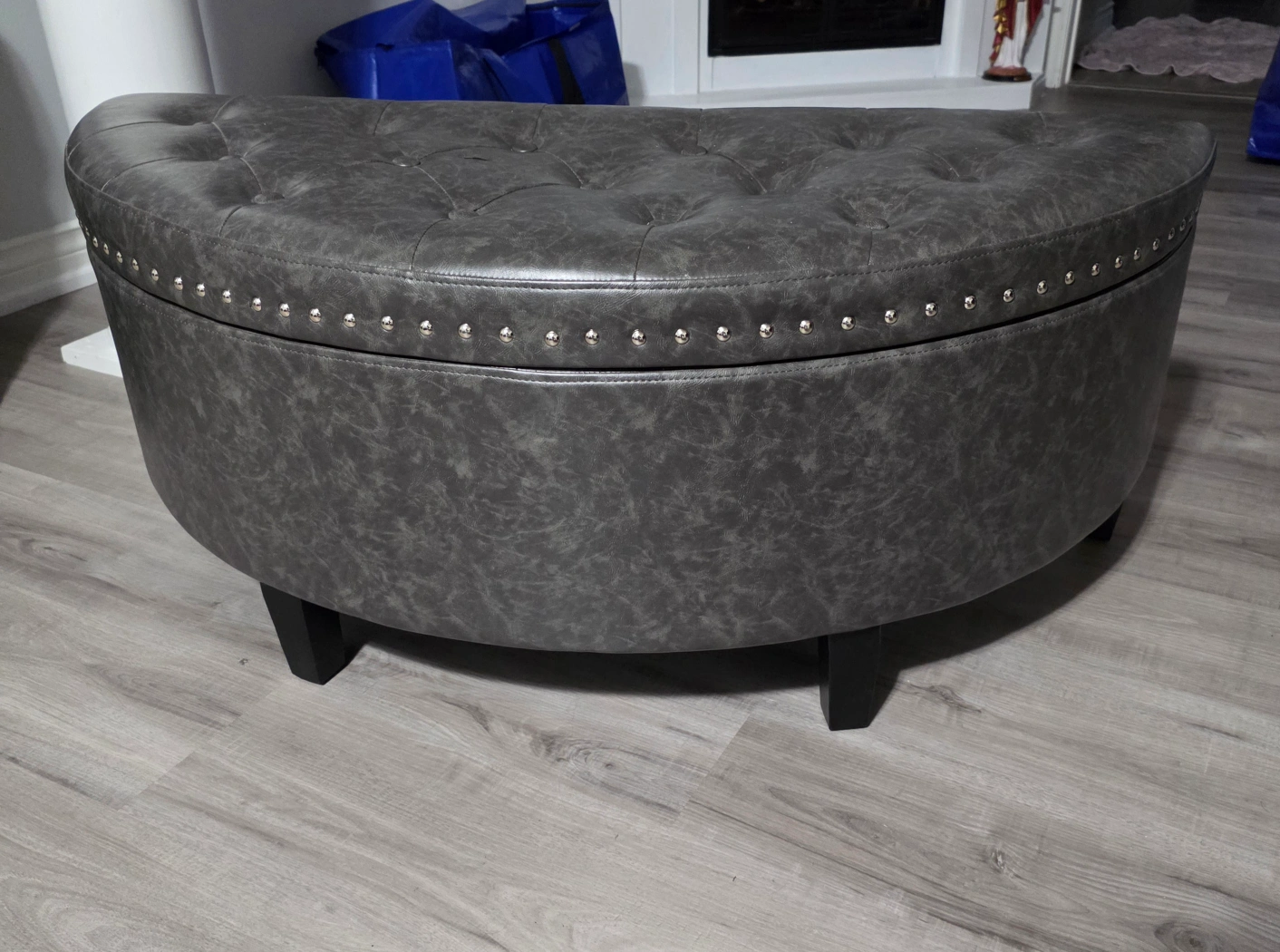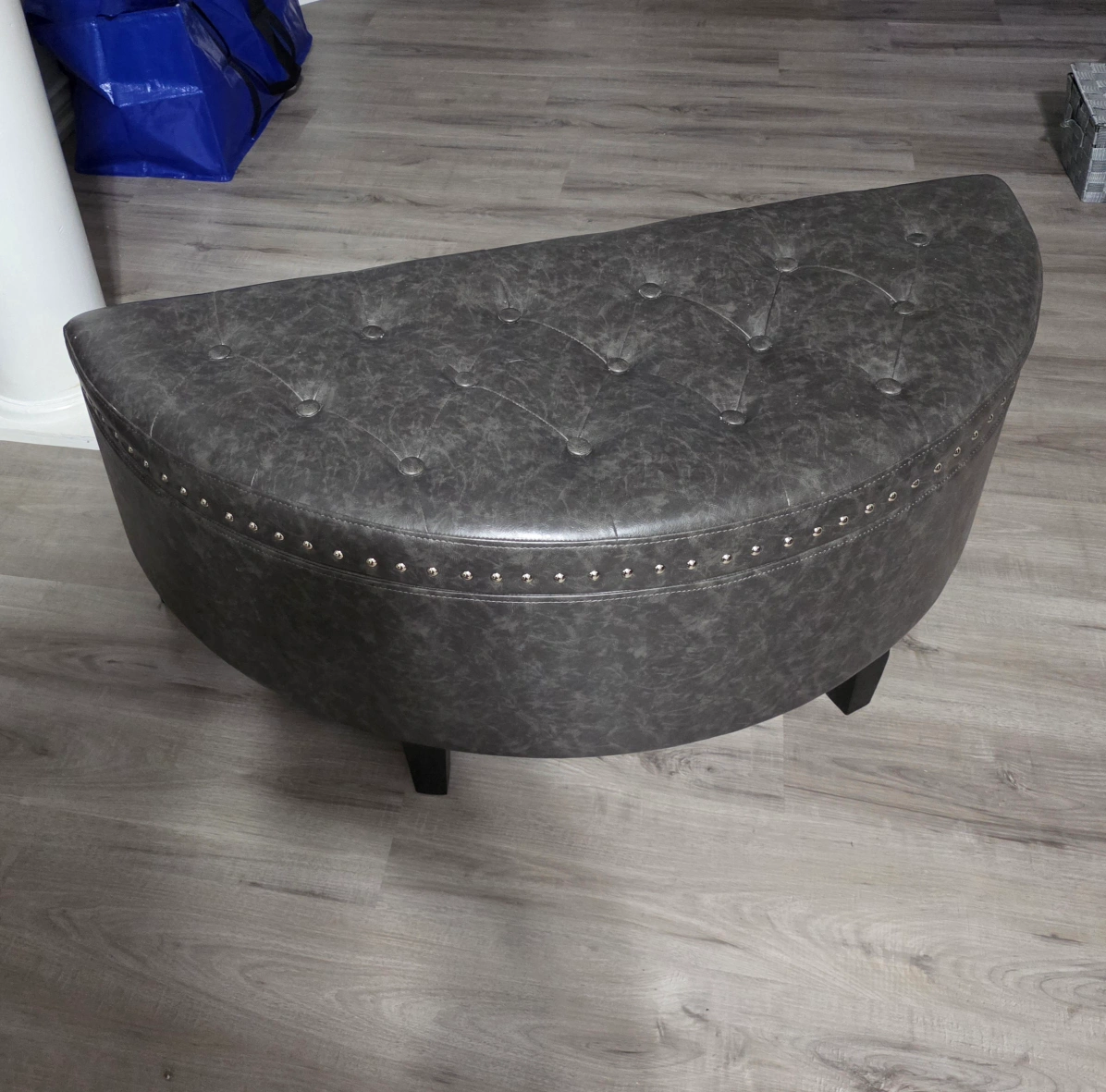 Grey leather stylish half-moon shaped storage ottoman. It's in great condition and perfect for adding extra seating and storage to any room. The grey colour and studded trim give it a modern look. It opens up to reveal a spacious storage compartment inside, making it ideal for blankets, pillows, or other items