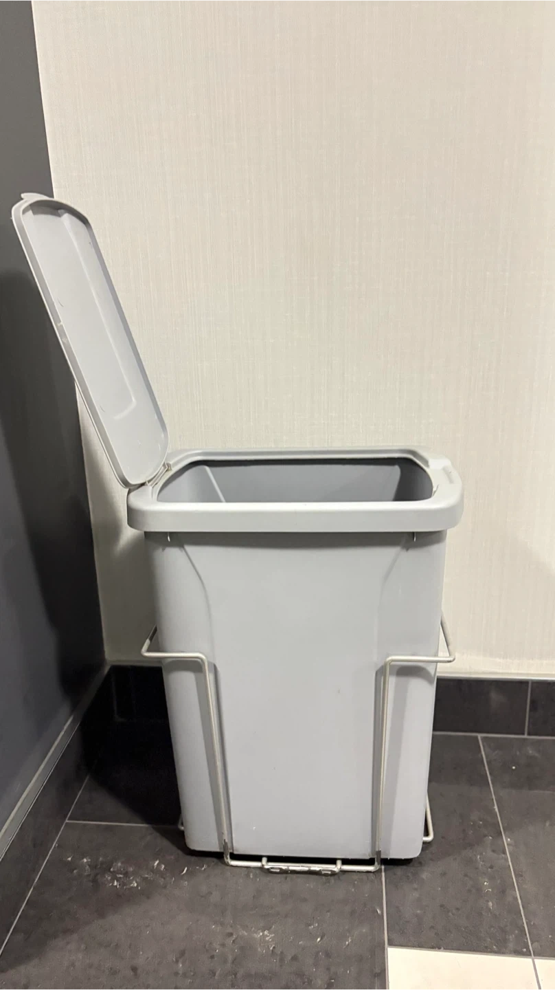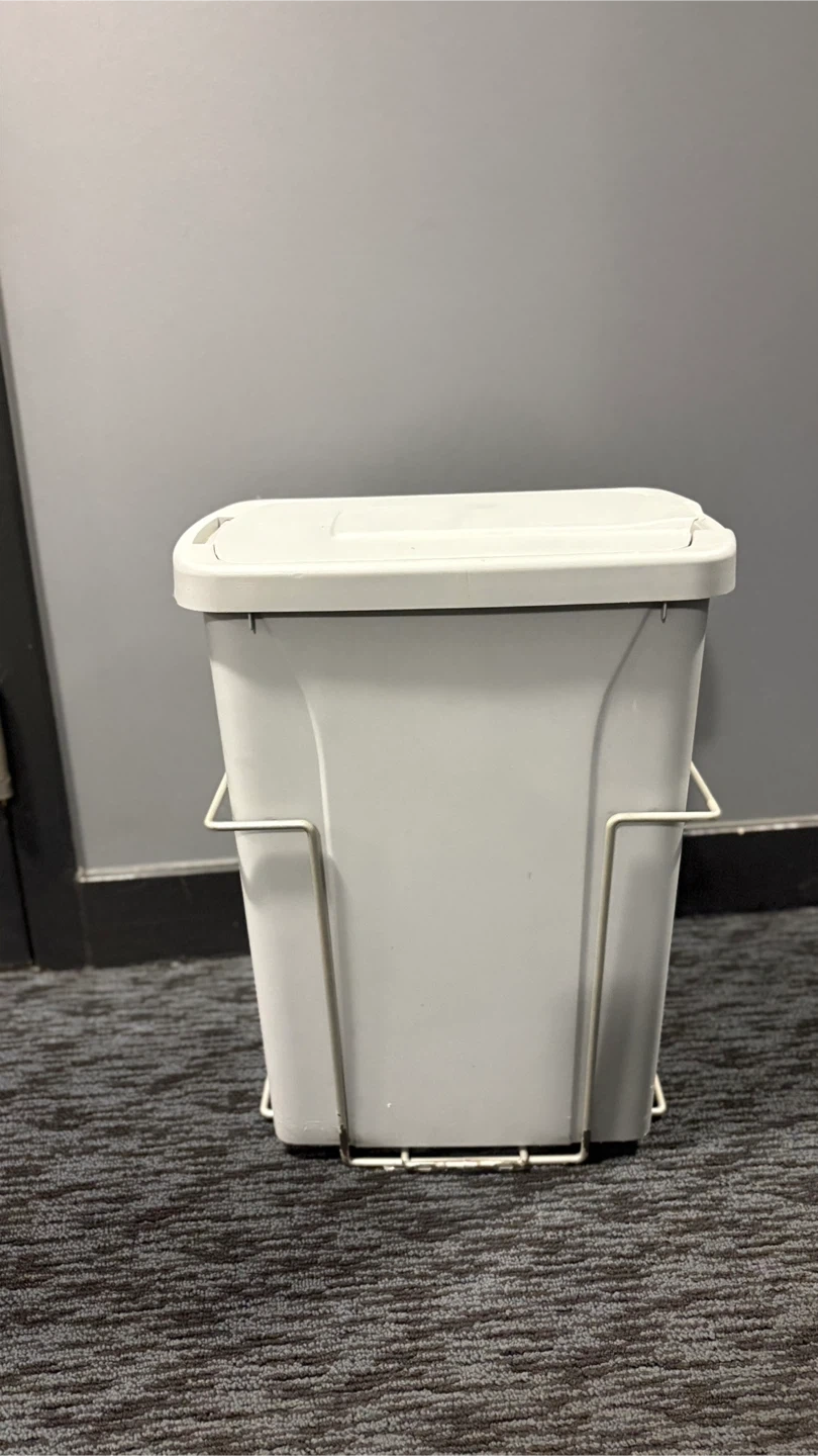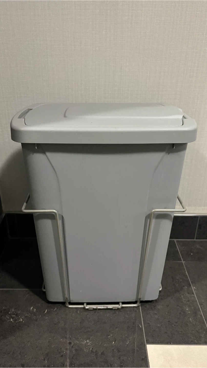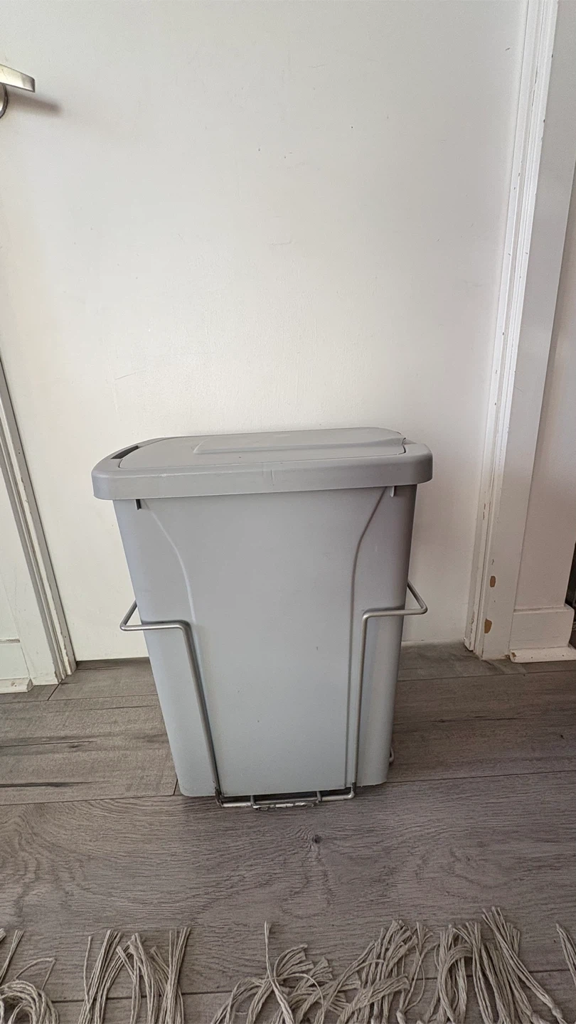 Selling a grey kitchen trash can. It comes with a lid and a metal frame to hold the trash can in place. Perfect for keeping your kitchen tidy!