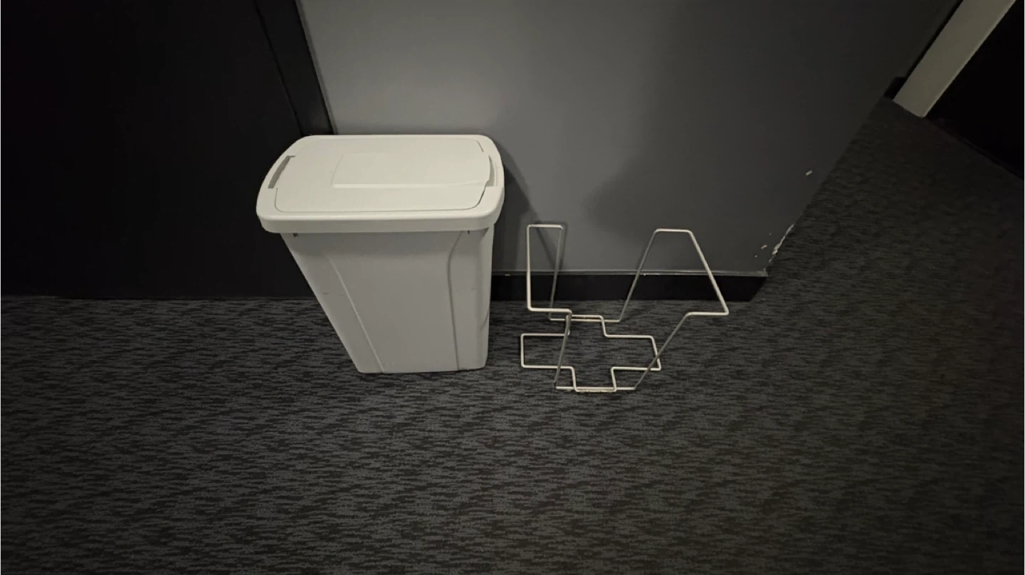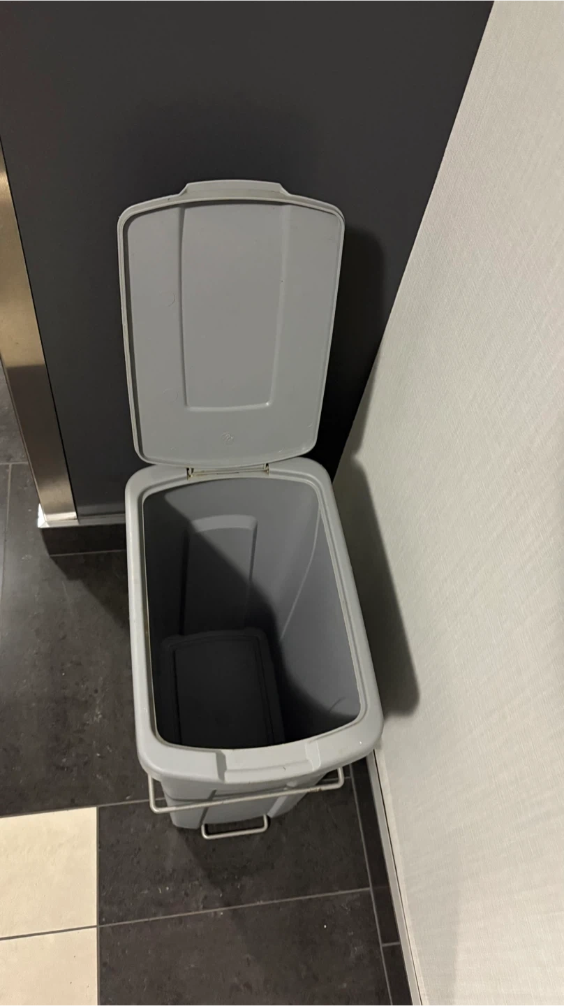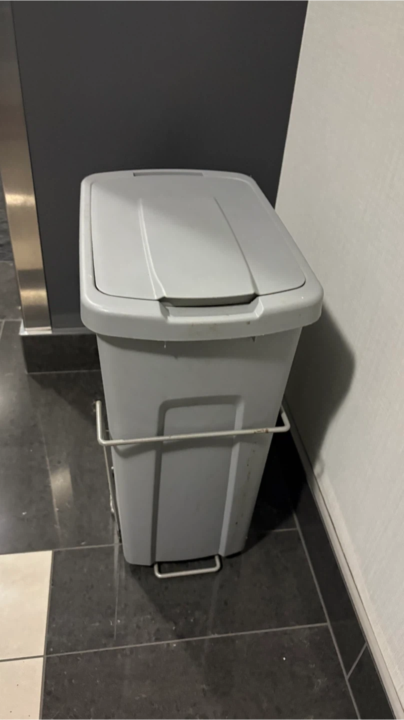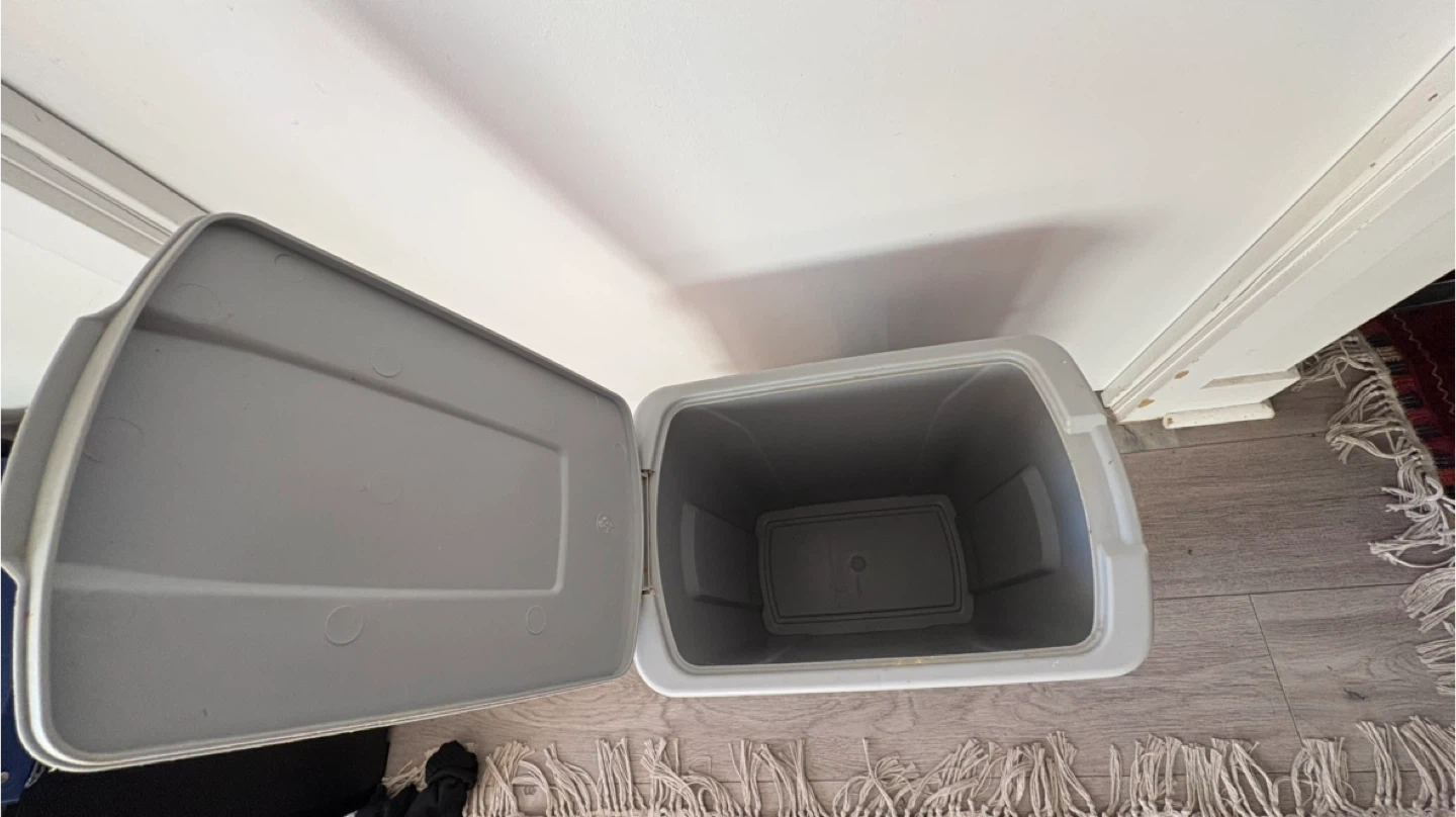 Selling a grey kitchen trash can. It comes with a lid and a metal frame to hold the trash can in place. Perfect for keeping your kitchen tidy!