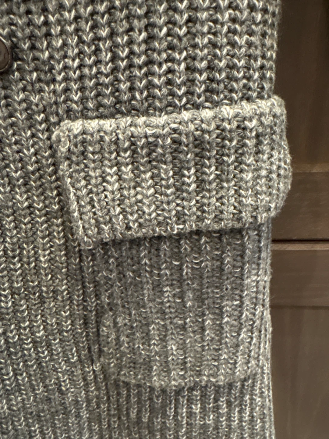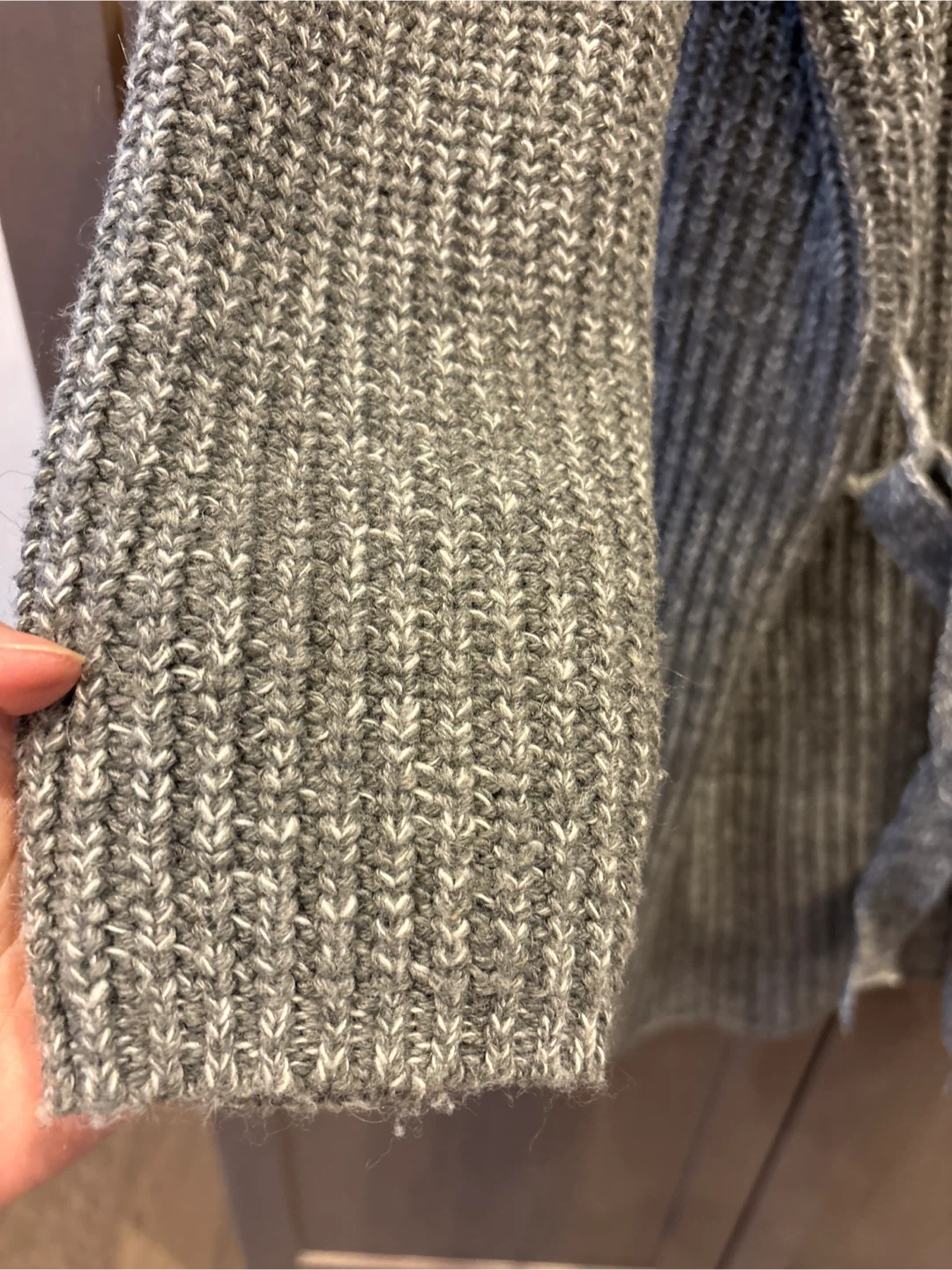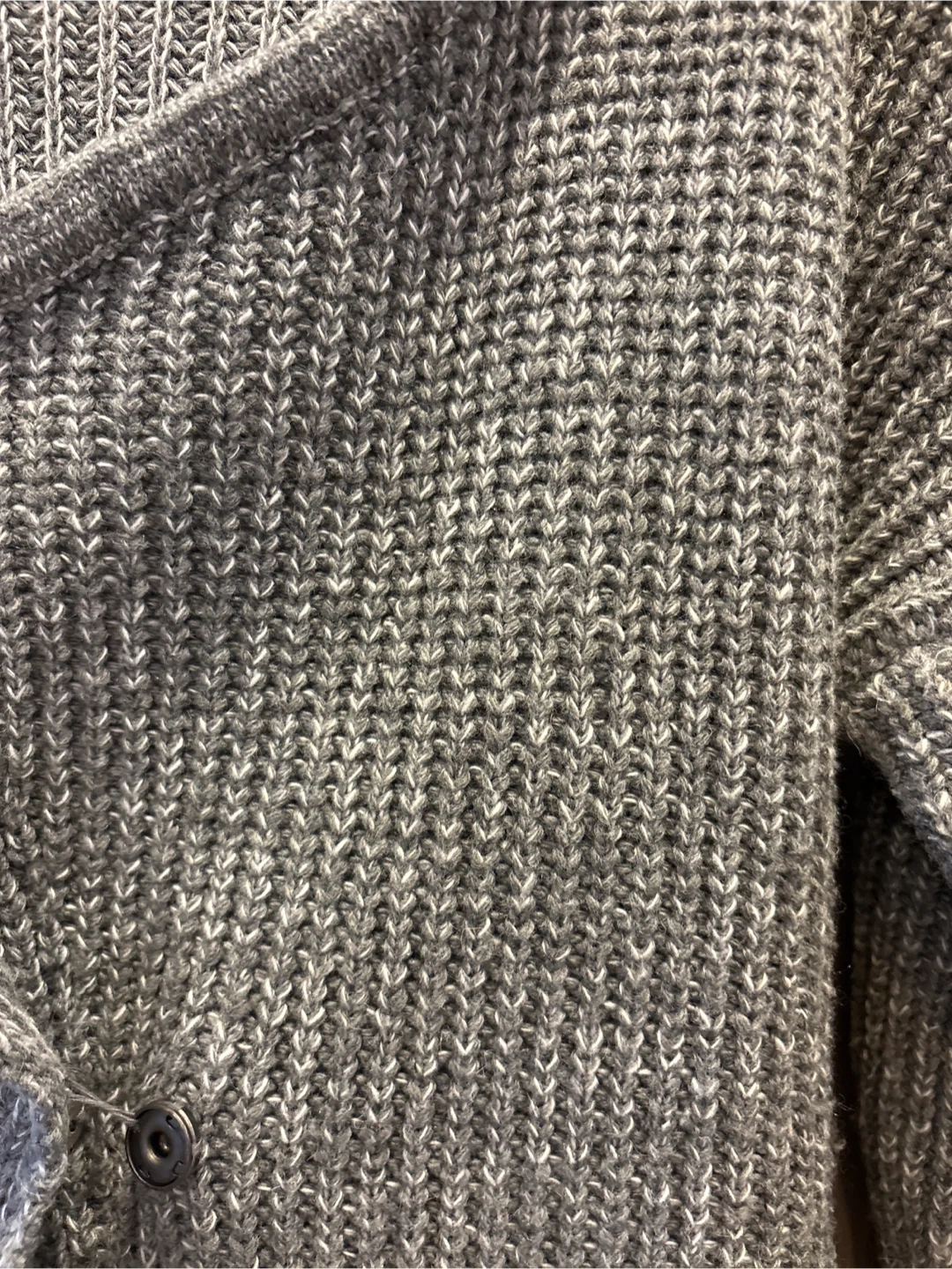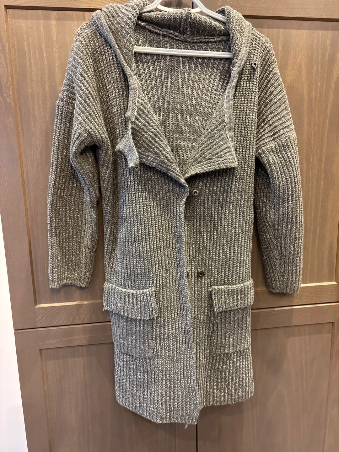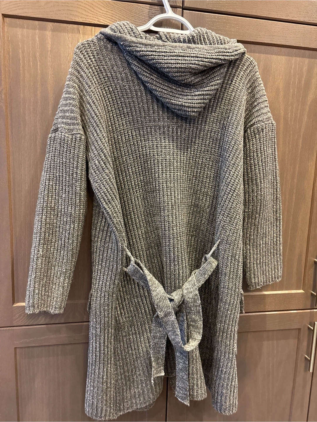 comfy grey knit cardigan! It features a hood, button closure, and a tie around the waist. Perfect for layering on those cooler days Waist 116cm Length 90cm