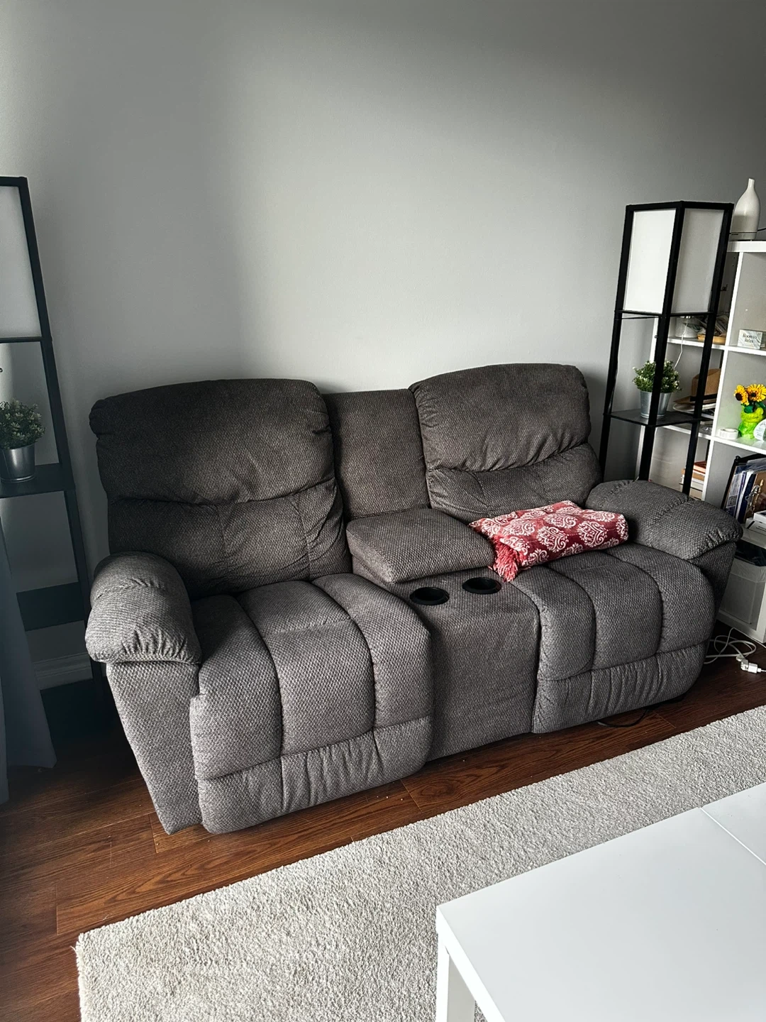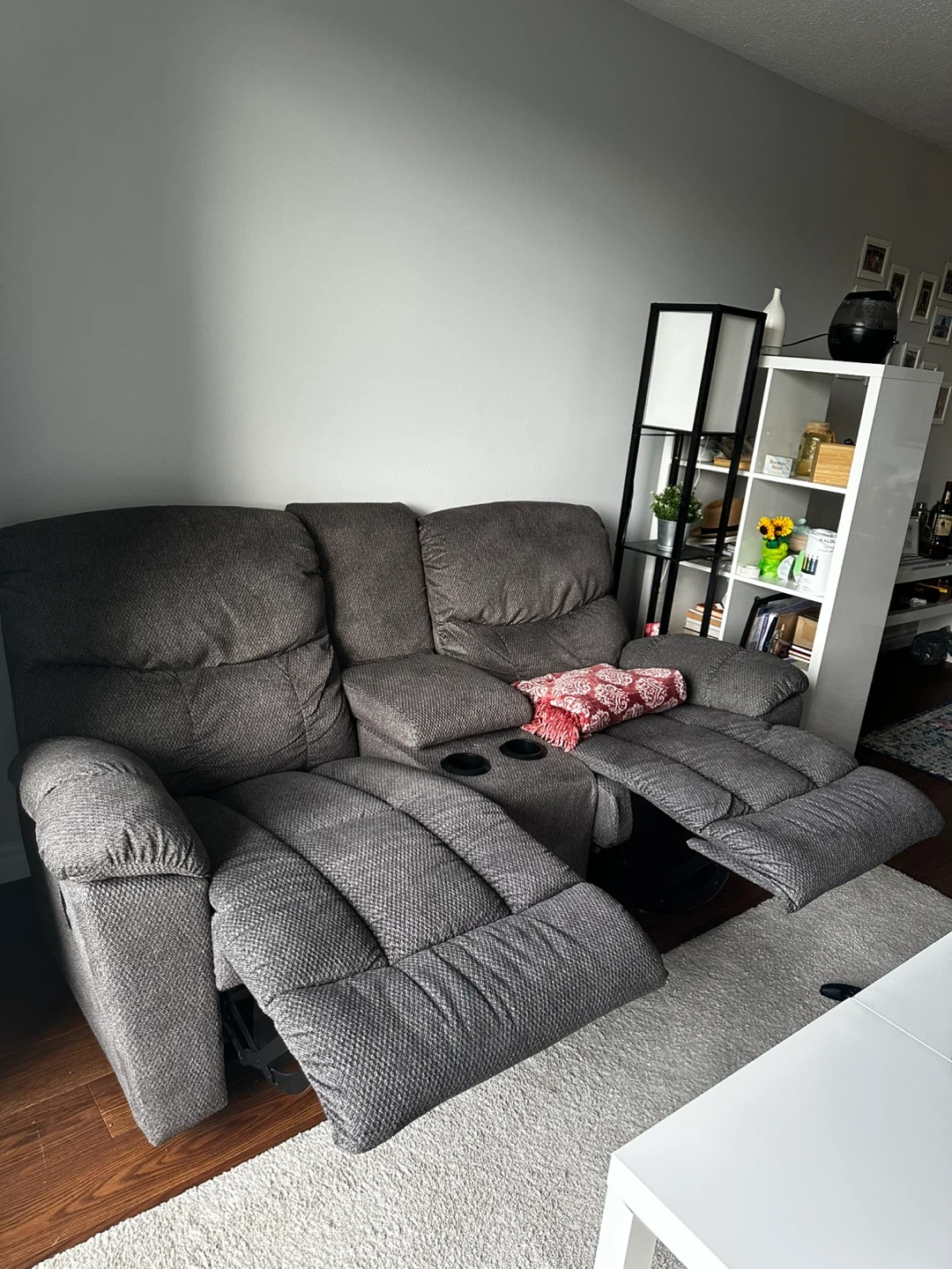 Selling a comfy grey double recliner. It's in great shape and perfect for relaxing after a long day! Bought 2 years ago and has extended warranty. It features a center console with cup holders for your drinks and snacks. Would be great for a movie room! Super comfortable. Selling as we are moving. Pet/Bug/Smoke free