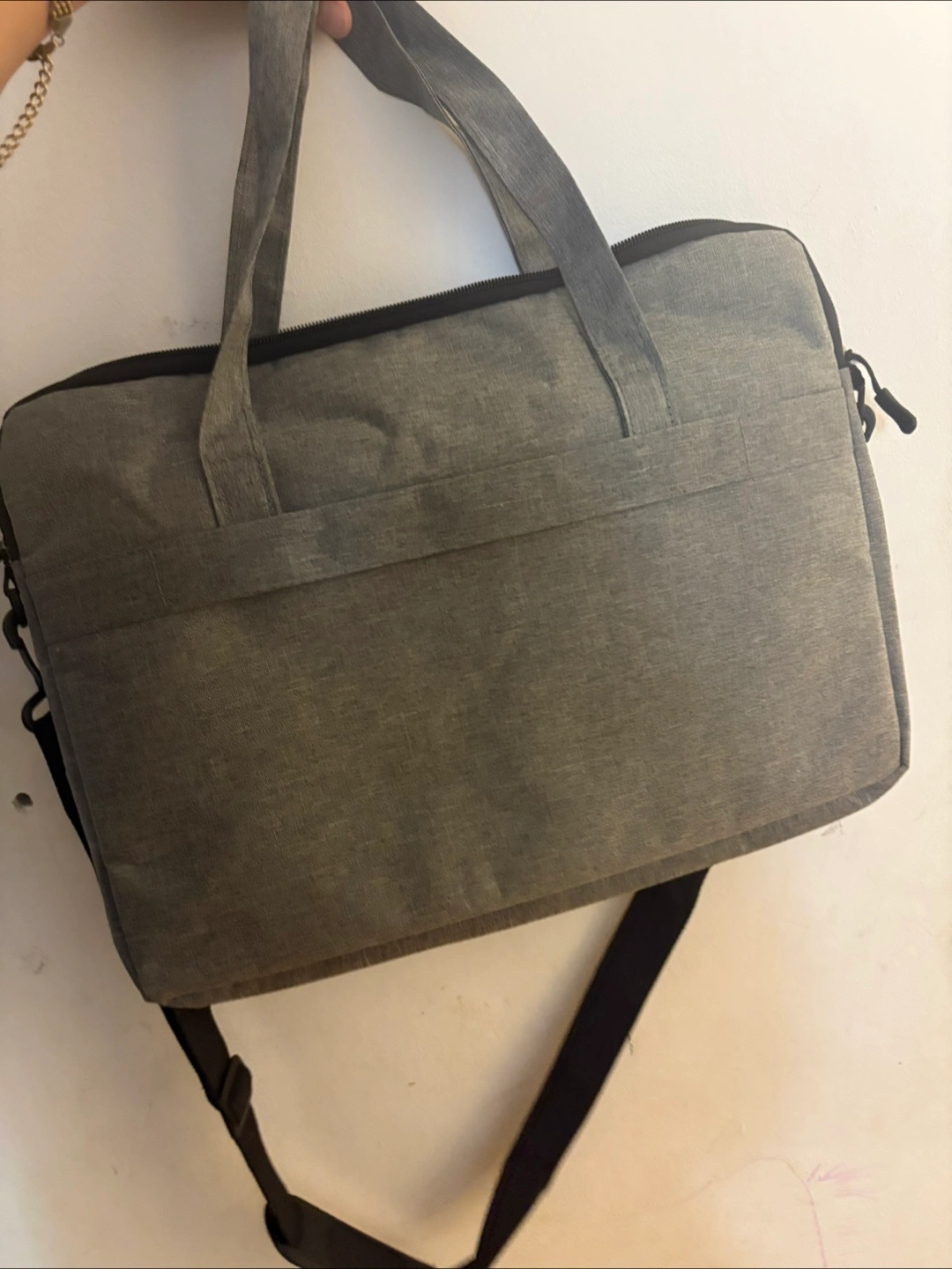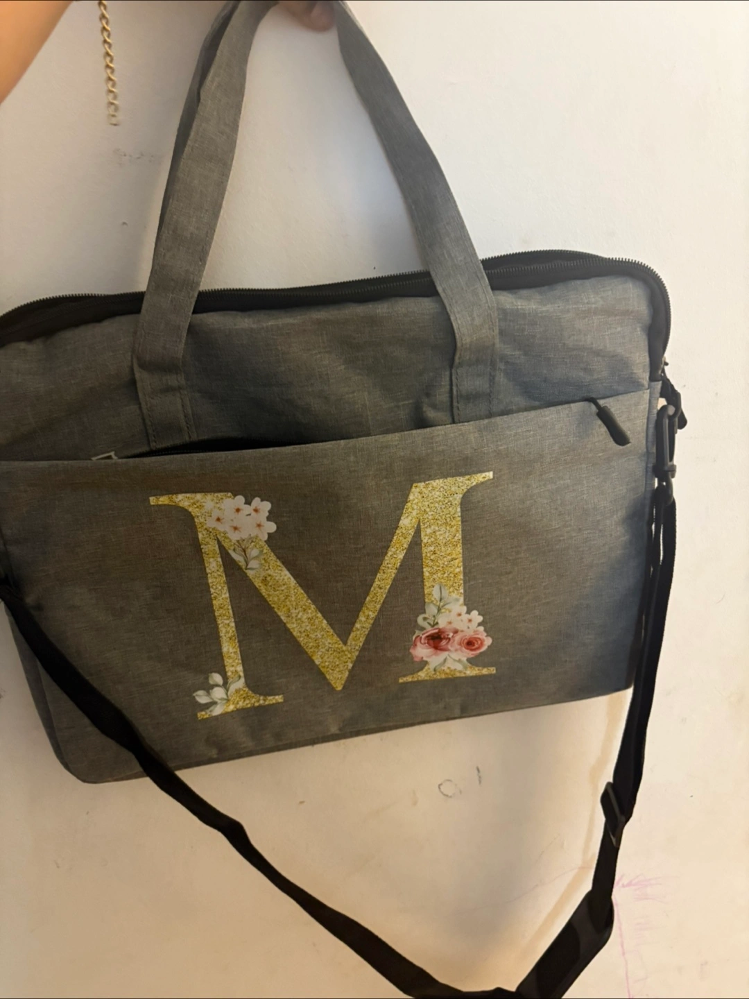 Selling a grey laptop bag with a shoulder strap. It has a large 'M' design on the front pocket. Perfect for carrying your laptop and accessories around town