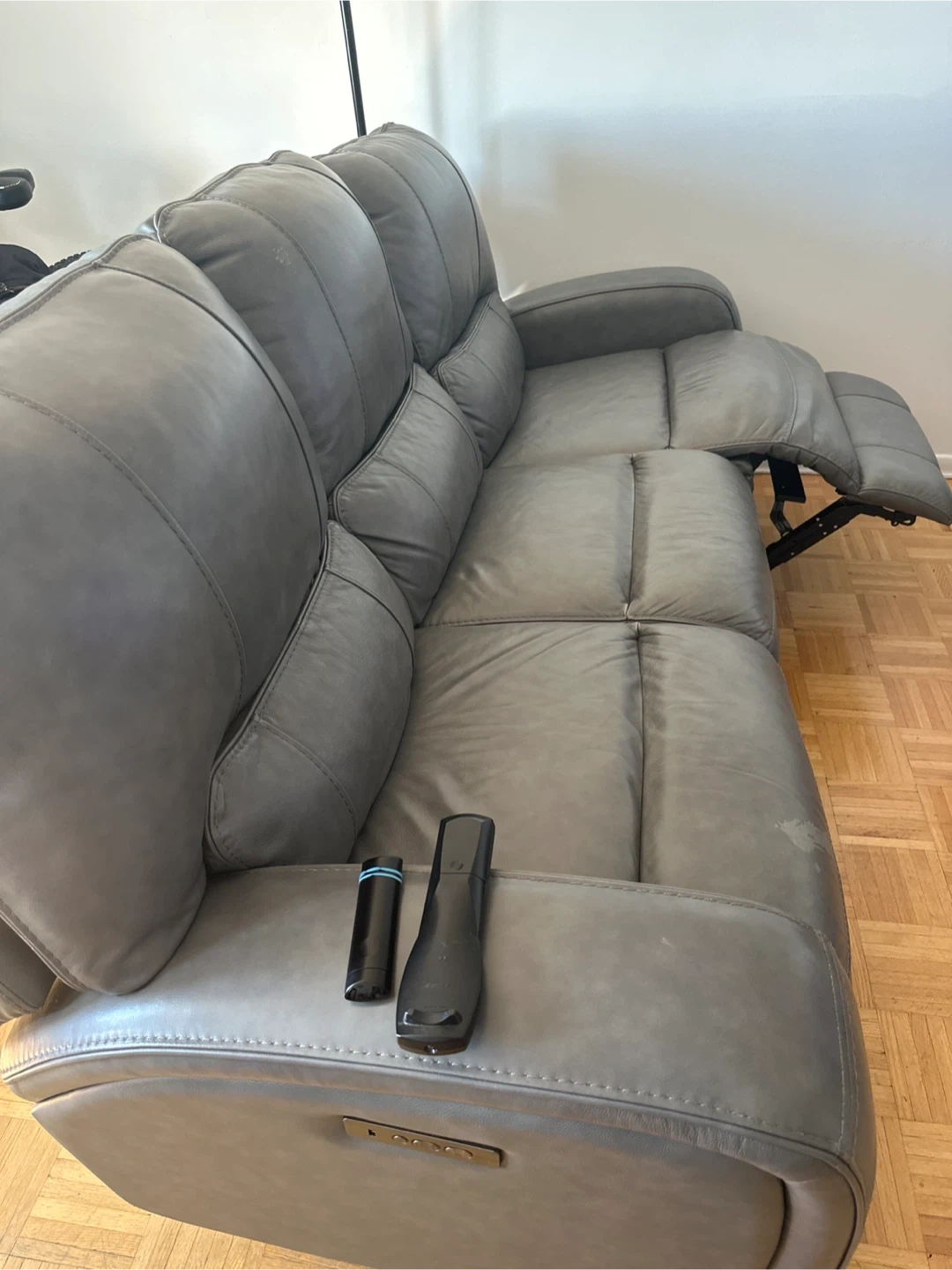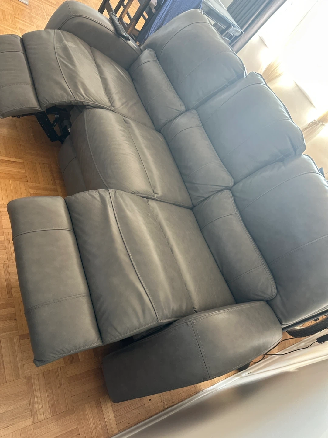 Selling a comfy grey leather reclining sofa! It's in great shape and ready for a new home. Perfect for relaxing after a long day! It looks great in any living room or entertainment space.