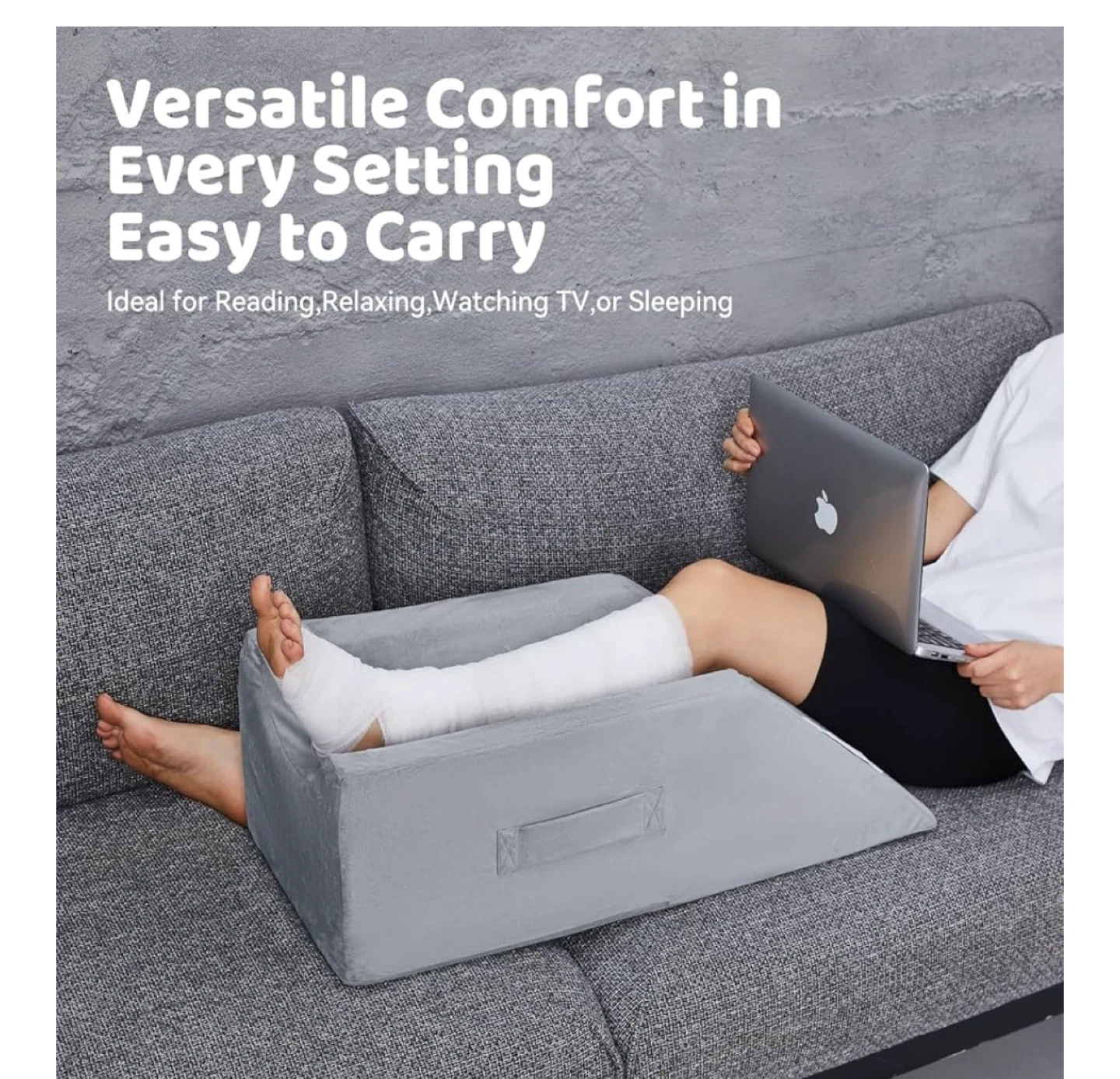 This grey leg elevation pillow is designed for versatile comfort, making it ideal for reading, relaxing, watching TV, or sleeping. It's easy to carry around the house too