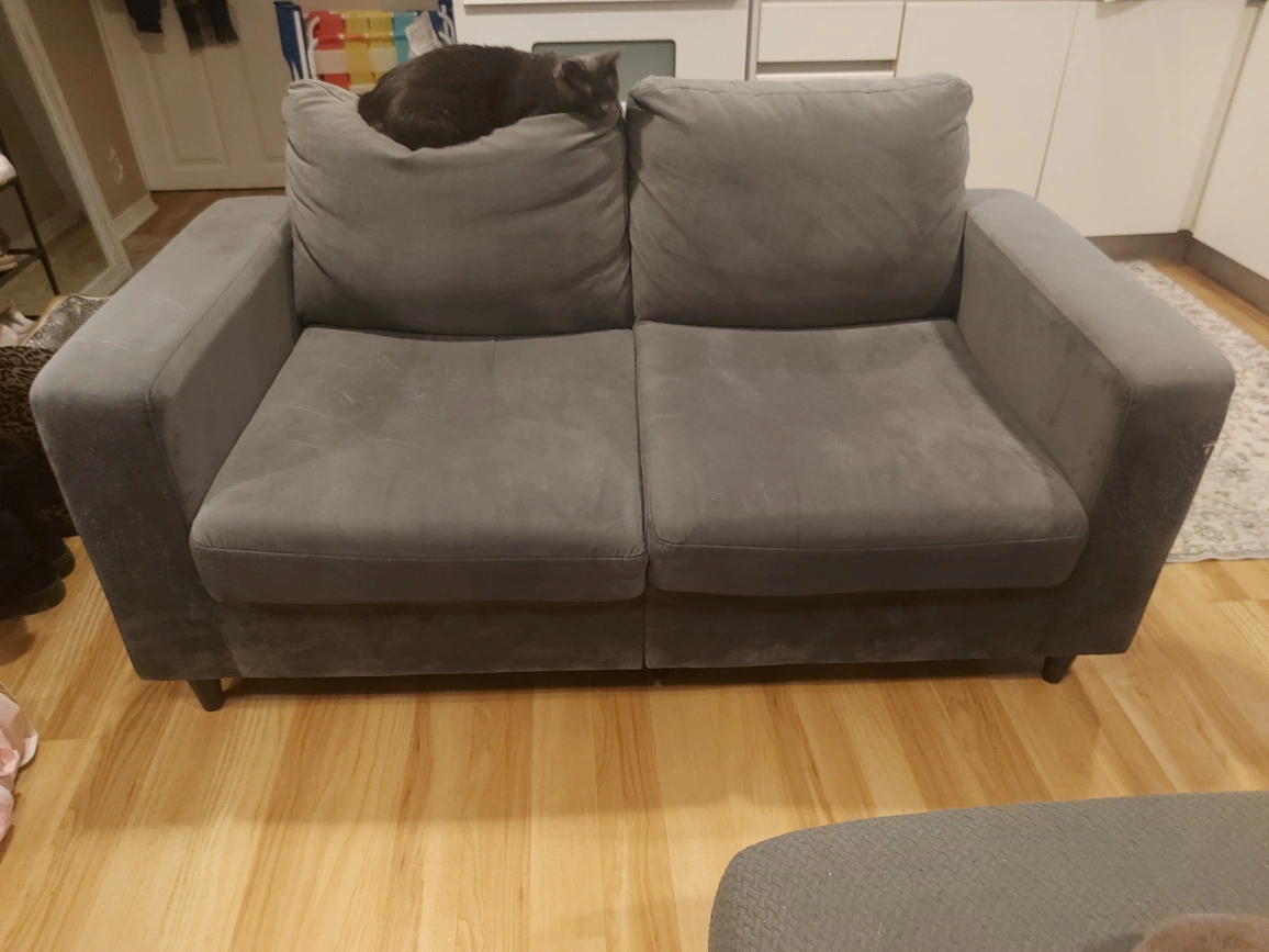 59 x 30 inches, 33 inches high Only owned a few years From a home with 2 cats (scratches on the arms) Velvet-like finish Can be disassembled into 2 parts, and all four legs come off, super easy for moving Pickup only