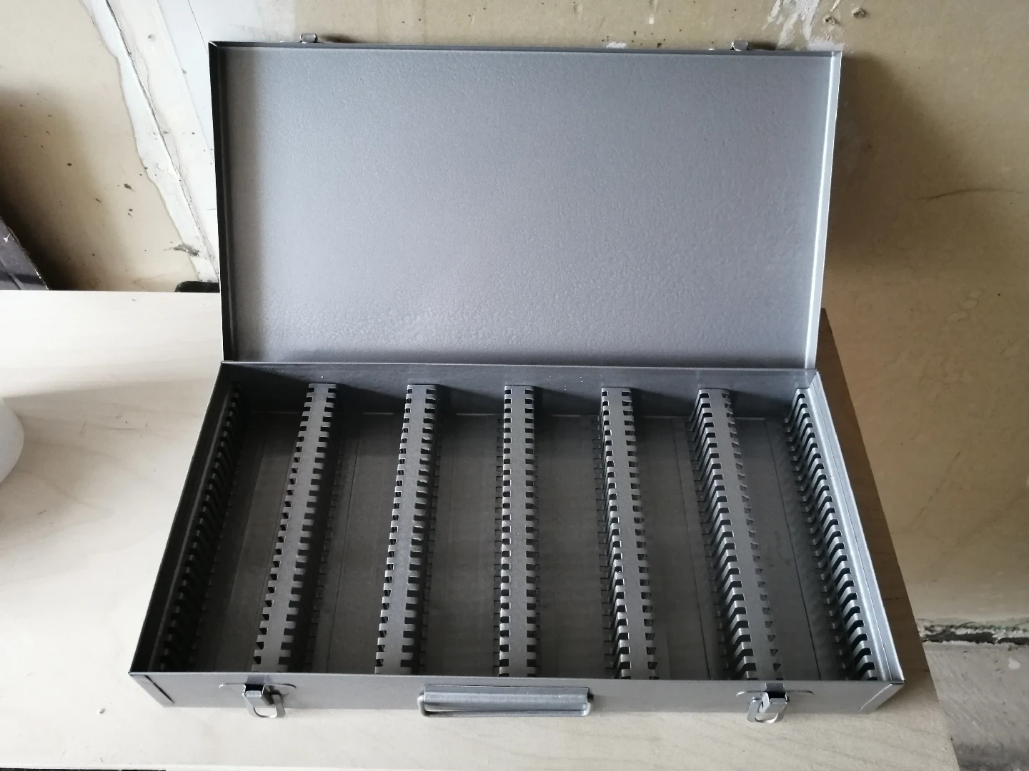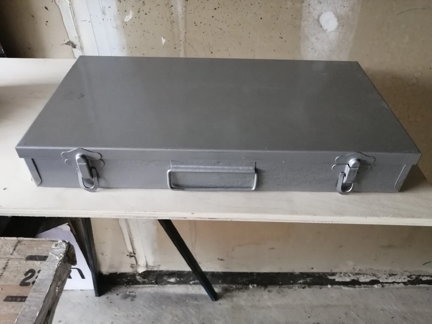 Selling a grey metal box. It is in good condition and has a handle for easy carrying. It has internal dividers inside. I have 6 boxes